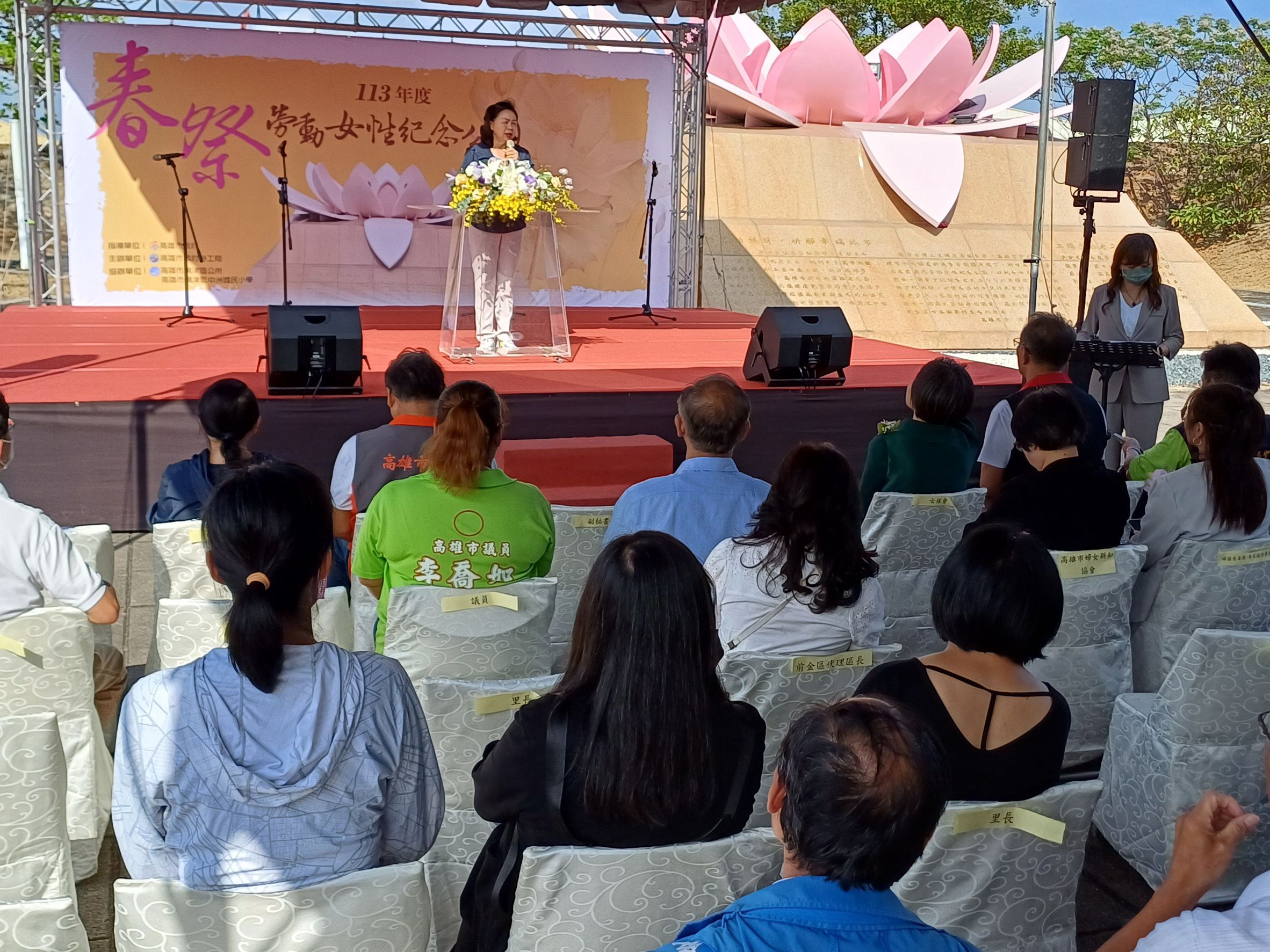 (記者黃思慈報導)高雄市政府今(23)日下午在旗津勞動女性紀念公園舉辦春祭活動,紀念女性勞動者對台灣社會與家庭的付出,由旗津區中洲國小學生合唱春祭主題曲「工廠吉他聲」,透過輕快的歌聲,緬懷1970年代每位在加工區中工作的勞工,默默付出青春背後,所展現的價值與勇敢。並由高雄市政府陳盈秀副秘書長、社團法人高雄市女性權益促進會蔡麗玲監事、勞工局周登春局長、社會局謝琍琍局長、旗津區長羅長安、鳳山區長石慶豐、前金區代理區長陳瑞勇,及中洲國小校長洪婉茹等貴賓及家屬代表共同獻上鮮花行禮追思。
