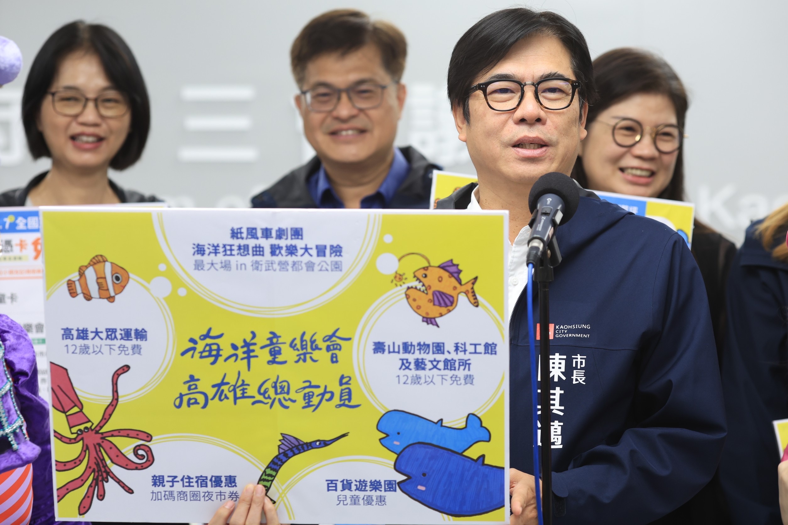 陳其邁市長與海馬、貝殼海洋人偶及高雄熊合體,以輕鬆活潑的方式向小朋友介紹《2024海洋童樂會 高雄總動員》系列活動,歡迎親子來趟歡樂大冒險、歡度兒童假期。(高雄市政府提供)