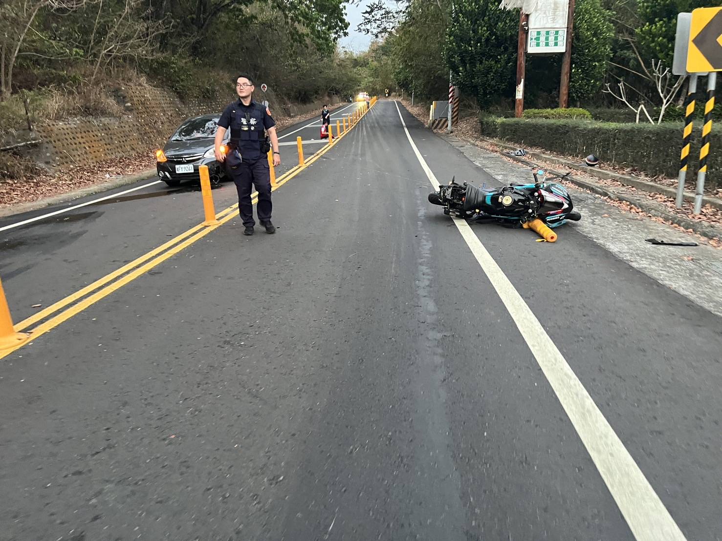 【記者張淑慧/高雄報導】113年4月1日17時許,仁武分局大社分駐所獲報大社區學府路段(台186甲線)發生騎士自摔遭對向車擦撞事故。員警馳援現場,經瞭解騎士武男(約26歲)騎乘大型重機車疑因路面油漬致自摔,進而與對向許女(約43歲)駕駛自小客車發生擦撞。
