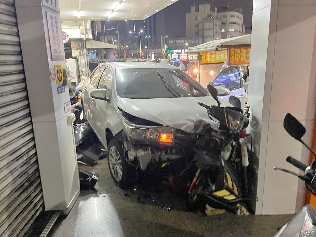 自小客車衝撞停在路3部機車(靜止狀態)、烤玉米攤位以及超商通道鐵欄杆。(記者翻攝)