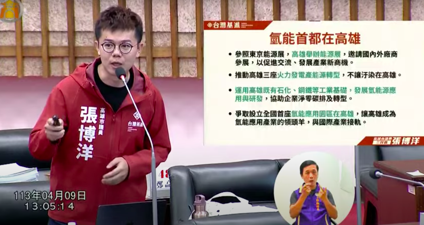 張博洋表示,二次能源轉型將加速電力系統的去碳化,其中氫能源為首重發展目標,二次能源轉型可以成為高雄擺脫高污染發電與產業的新機會。中央挹注資源、搭配高雄自身的產業及港口優勢,高雄絕對有條件爭取「氫能首都」。