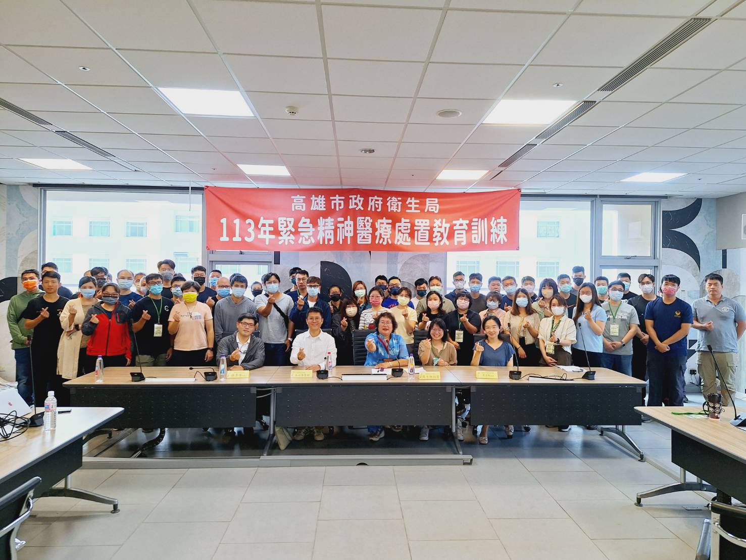 高雄市衛生局攜手警察、消防同仁共訓緊急精神醫療處置教育訓練(中)高雄市政府衛生局社區心衛中心蘇淑芳主任、(左一)林季璜警務正(左二)林皓陽醫師(右一)李碧芬消防局技士(右二)呂佳虹組員。(高雄市政府衛生局提供)