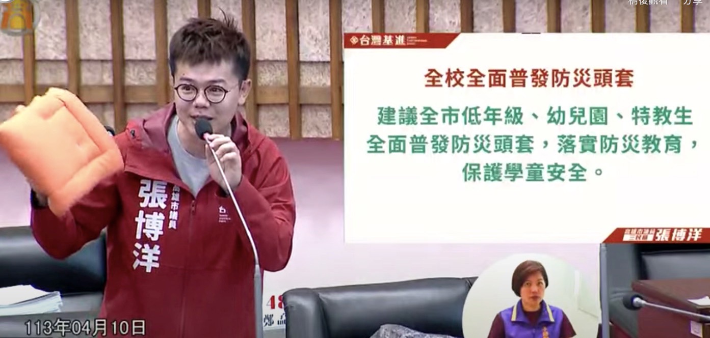【記者蘇武智/高雄報導】0403花蓮大地震看到外縣市許多學校學童都有頭戴防災頭套避難,然而高雄市的學校並沒有普發,由各校自行評估採購。台灣基進高雄市議員張博洋今天在議會教育部門質詢,爭取高雄應普發防災頭套,保障孩童安全。