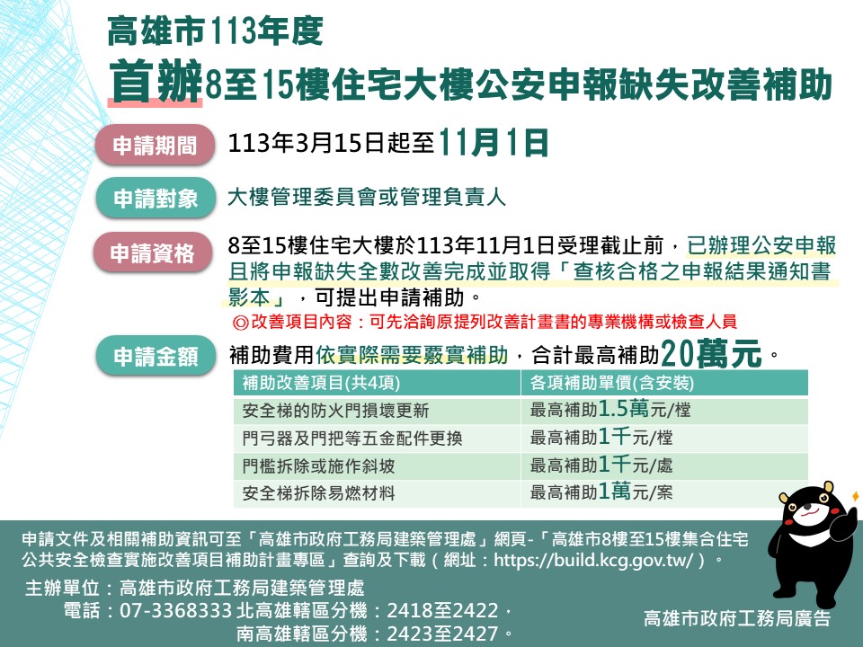 工務局指出,申請文件及相關補助資訊可至「高雄市政府工務局建築管理處」網頁-「高雄市8樓至15樓集合住宅公共安全檢查實施改善項目補助計畫專區」(網址:https://build.kcg.gov.tw/)查詢及下載,歡迎多加運用。