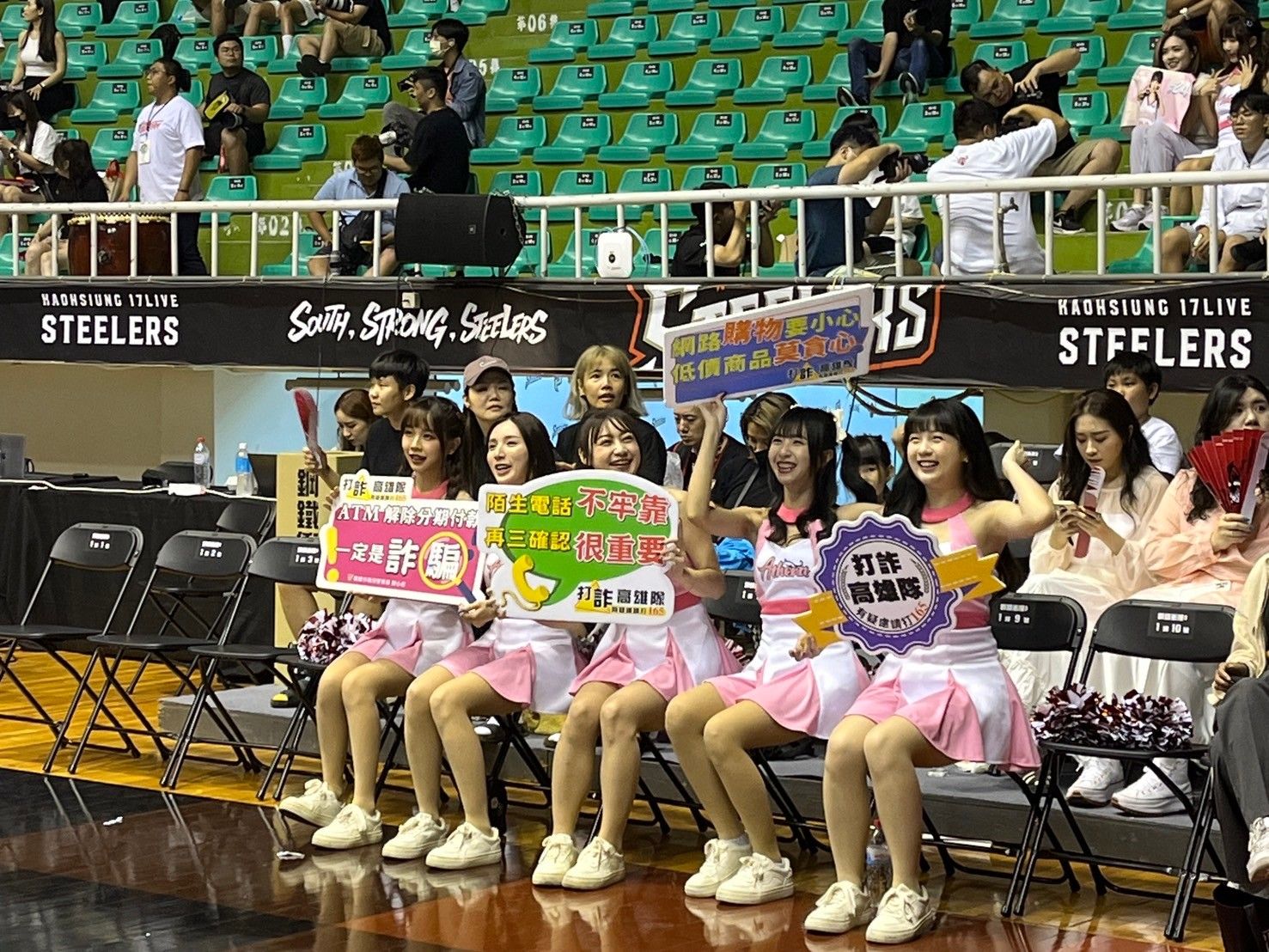 有鑑於詐騙案件越發猖獗,鳳山分局為加深民眾識詐觀念,特別與職籃高雄鋼鐵人合作宣導,場外除了架設宣導攤位,並以近期的「假投資詐騙」、「假網路購物詐騙」「解除分期付款詐騙」等高發詐騙手法進行宣導,鋼鐵人球團特地邀請鳳山分局員警及眷屬進場觀賞賽事,並於中場休息時以「我的⼥神Style」主題,由鋼鐵女神雅典娜結合鳳山分局女警與現場球迷進行識詐有獎徵答活動,現場送出刑事小熊及遙控巡邏車,讓參與活動的球迷都大讚印象深刻。