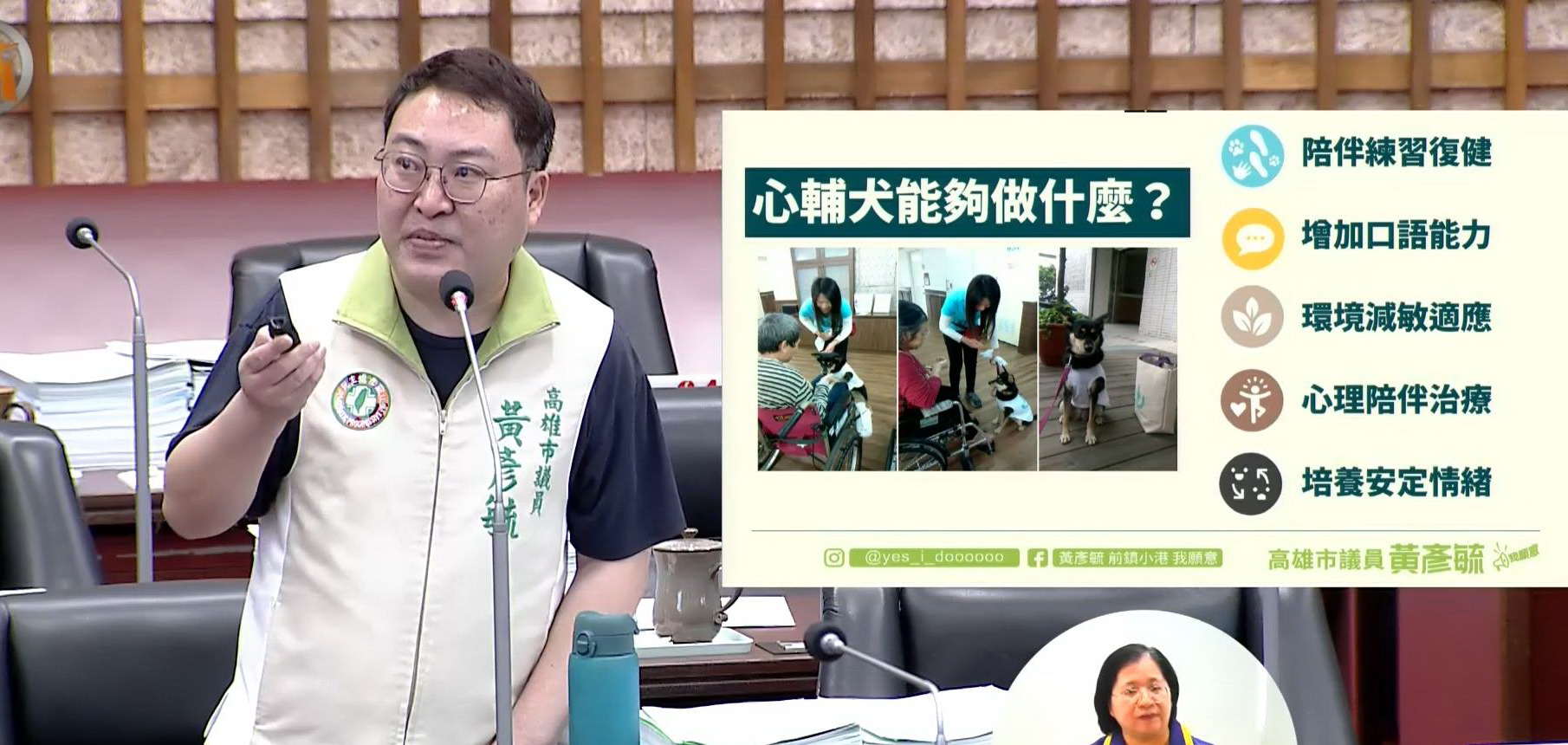 黃彥毓表示,2022年統計,高雄市流浪犬隻數量超過一萬五千隻,儘管動報處很努力辦領認養活動,但因2017年起已禁止撲殺,在收容所的浪犬如果一直未有人認養,最後只能在收容所老死,如果輔導成為心輔犬在醫療上有困難,建議也可以找其他非醫療的機構合作,與社會局或衛生局來進行相關的培育計畫,讓這些流浪毛小孩的生命有其他出入,也能協助社會上需要幫助的人,進行善的循環。