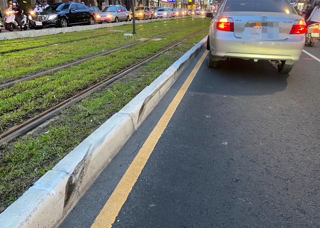 轎車闖高雄輕軌卡緣石。(苓雅分局提供)