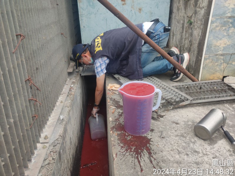 【記者謝富益/高雄報導】環保局今(4/23)日持續針對鳳山溪水污染管制區加強稽巡查,於鳳山區鳳仁路巷弄內側溝發現一股血紅色廢水排出,人員循線往上游查察,查獲一家膠囊保健食品工廠,未妥善收集處理製程廢水即排放,已違反水污法第30條規定依法告發。