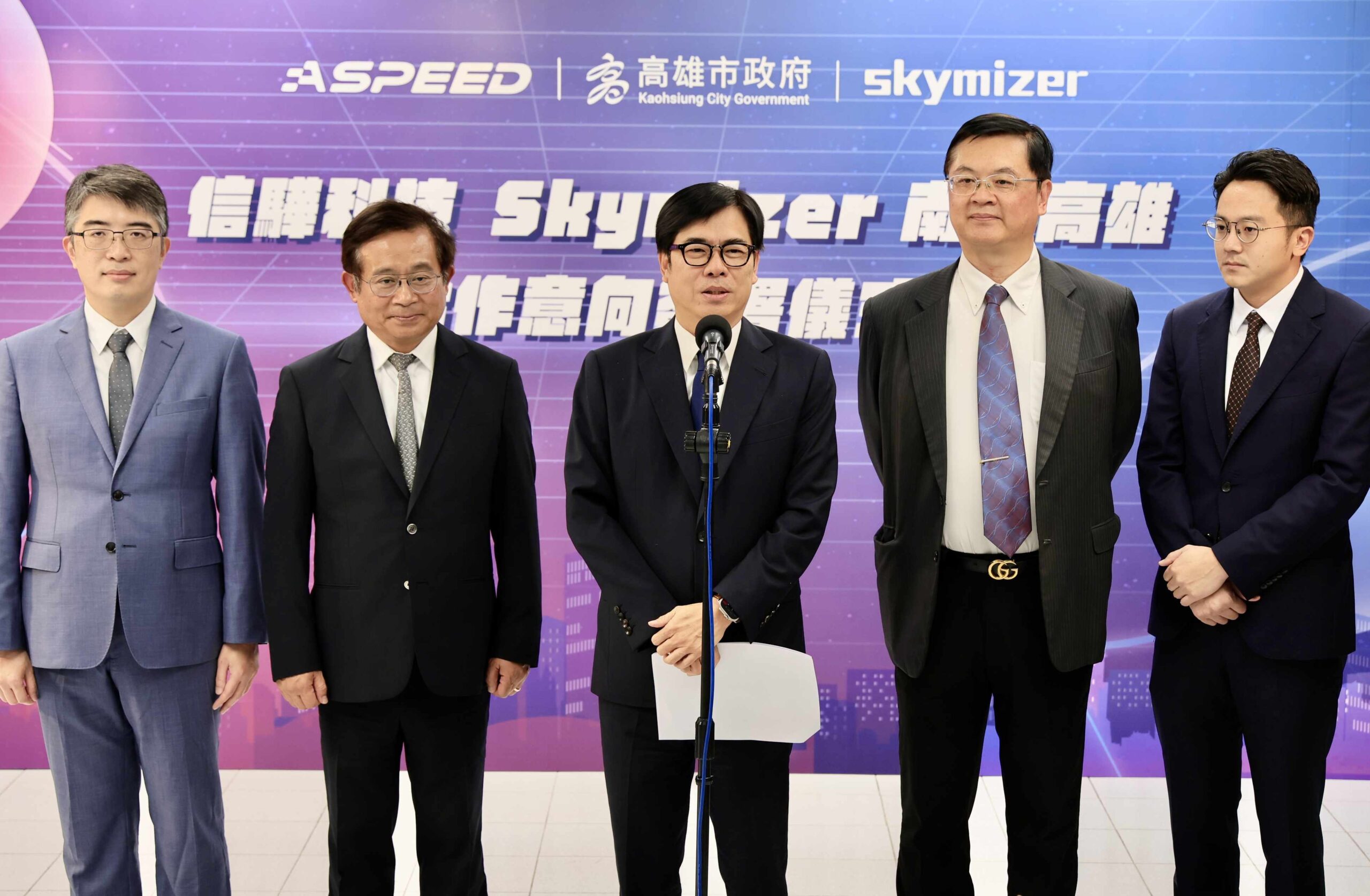 市長陳其邁見證簽署合作意向書並與Skymizer執行長唐文力及信驊科技董事長林鴻明合影。(高雄市政府經發局提供)