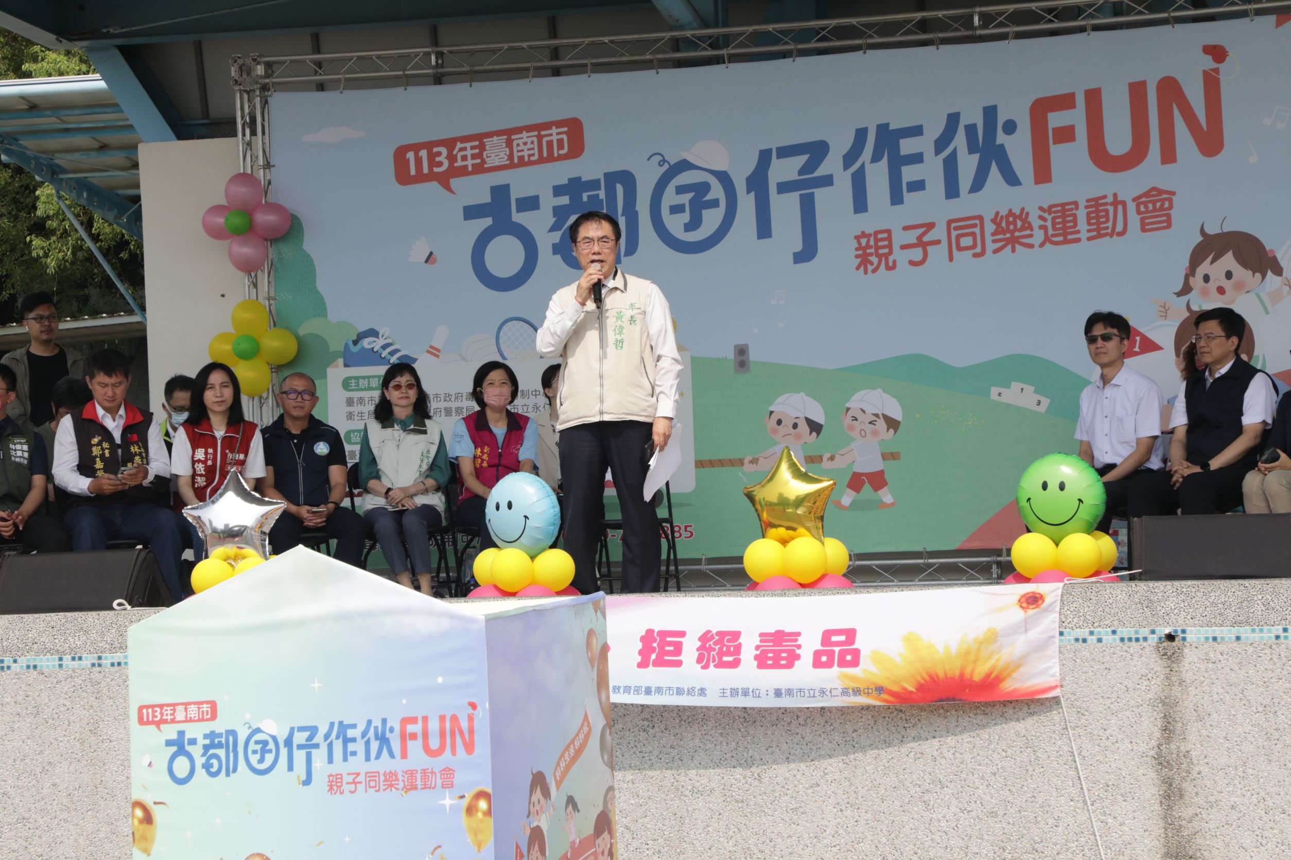 (記者謝富益報導)臺南市政府毒品危害防制中心今(4)日辦理「古都囝仔作伙FUN」親子同樂運動會,由市長黃偉哲到場致詞,邀請永仁高級中學慈暉班同學精彩舞龍舞獅揭開序幕,市長黃偉哲期勉家長與孩子共同建立健康生活型態,勇於拒絕毒品誘惑。市議員楊中成、黃肇輝到場支持。
