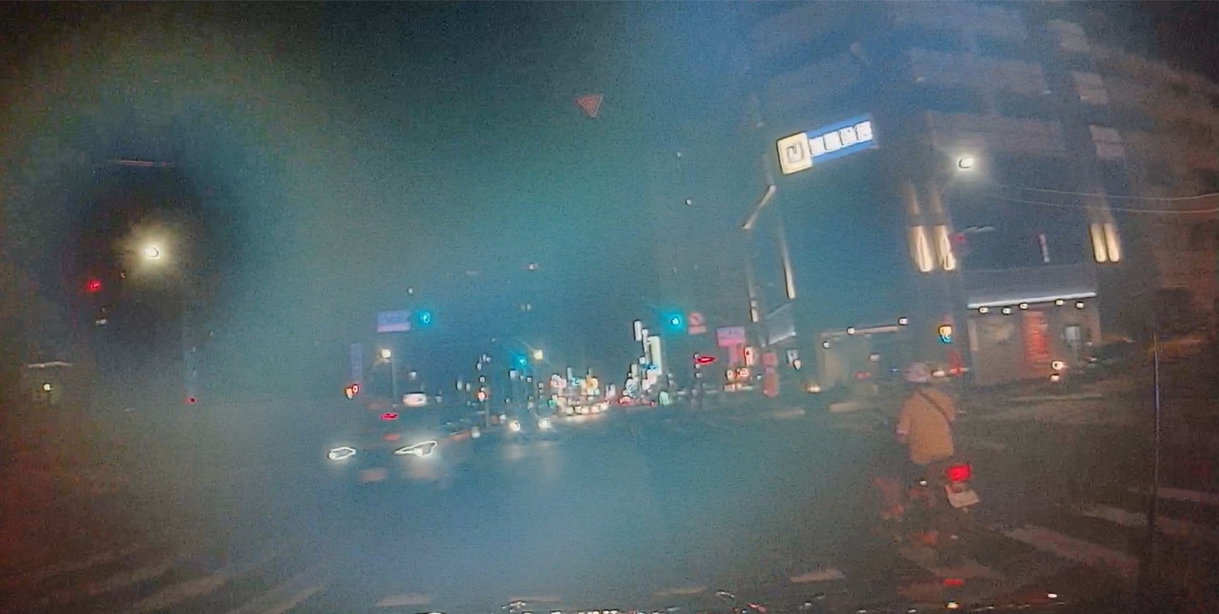 泰國籍移工騎乘電動機車竟低頭使用手機,警車在旁也完全未發現。(記者翻攝)