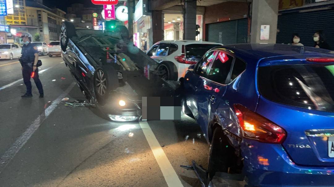 轎車自撞四輪朝天。(高雄市鳳山警分局提供)