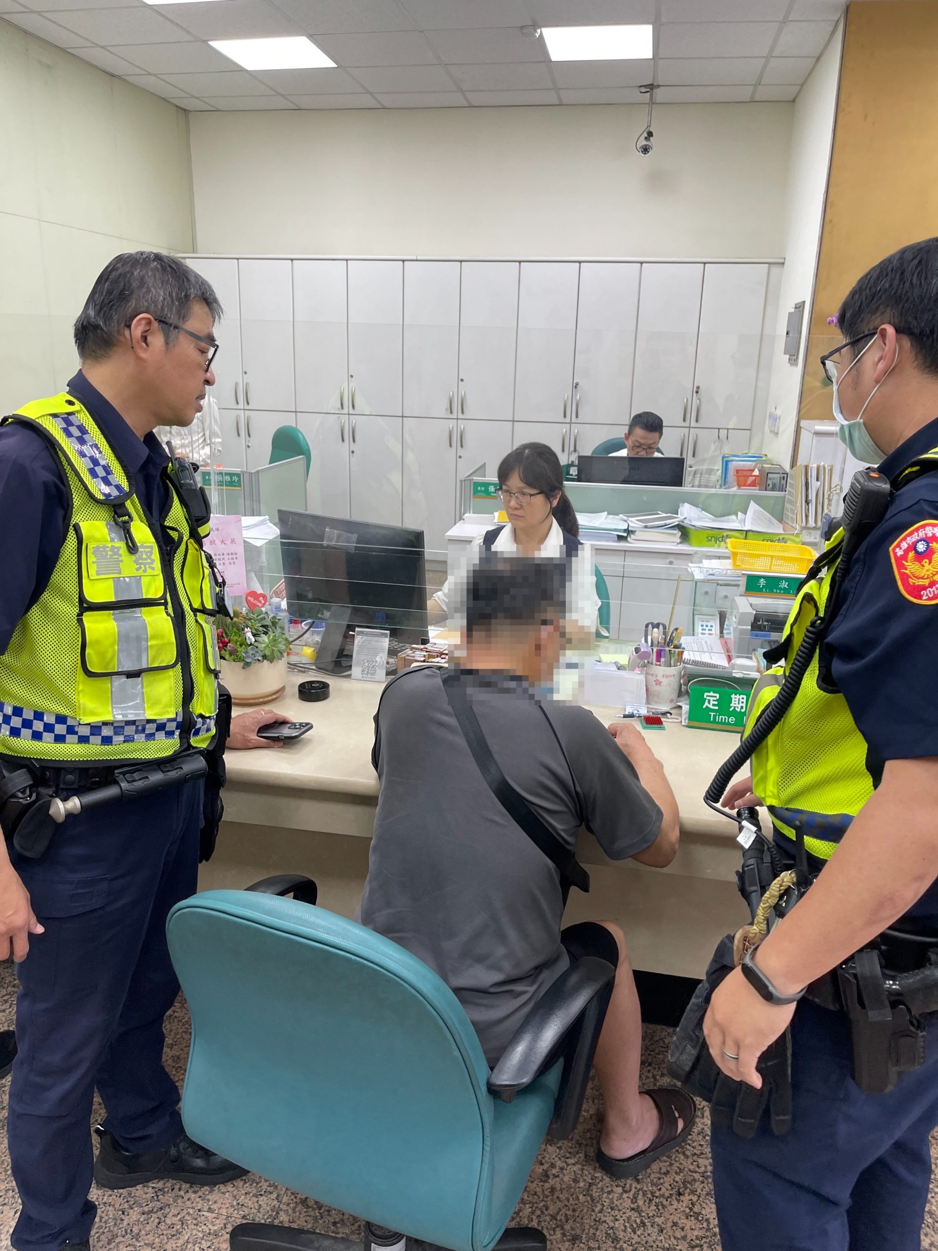 鳳山區五甲二路合作金庫通報有民眾疑似遭詐,南成派出所副所長賴豪君、警員鍾嘉昇、洪世唐、舒啓瑋到場後,王姓男子(60歲)自稱接到苓雅區公所和自強派出所電話,表示有人拿他的身分證去銀行要開戶,因為不是本人被銀行擋下,但帳戶已遭警方凍結。