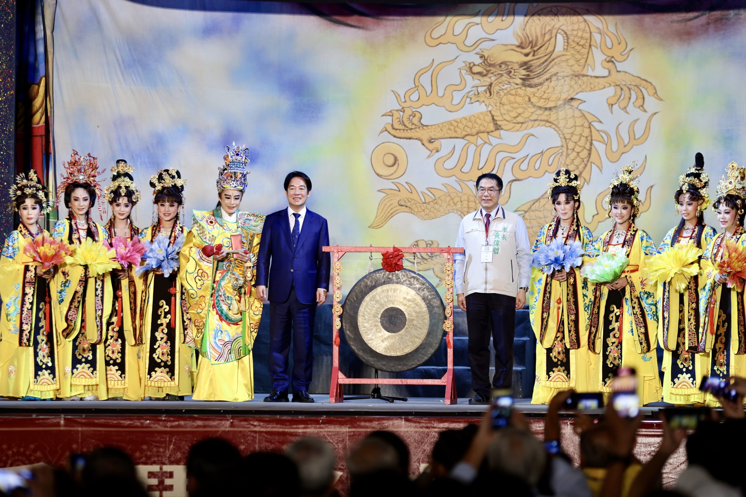 《蟠桃大會慶狀元》於昨晚七點半正式開演,現場超過2500人齊聚觀賞。準總統賴清德特別提早抵達林默娘公園,在黃偉哲市長的陪同下前往囍市集走逛,與店家、民眾親切互動,並在開演前進行祈福敲鑼儀式,敲響鳴鑼三聲,為國人及國運祈福。