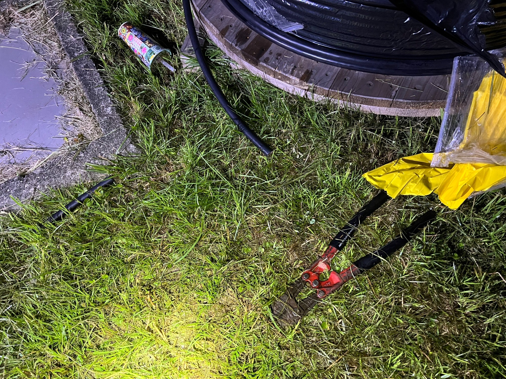 圖說-新竹縣峨眉變電所昨(18)日凌晨發生疑似入侵竊盜電纜事件,現場也遺留爬梯、破壞剪等工