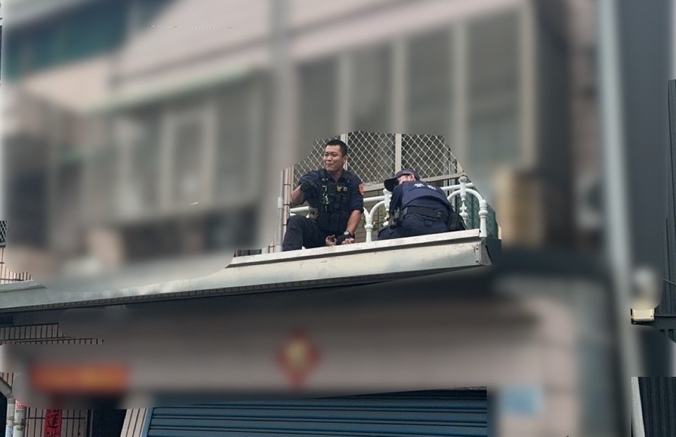 陳男至要求復合遭拒,竟攀爬上蔡女住處一樓車庫頂。(高雄市楠梓警分局提供)