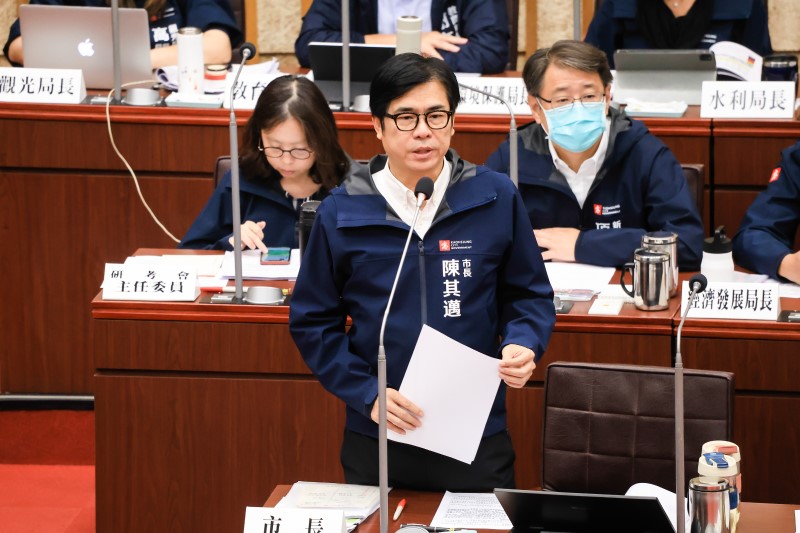市長陳其邁於市政總質詢回應說明高雄產業、經濟、交通、人口及生活等議題。(記者翻攝)