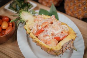 (記者張淑慧報導)高雄鳳梨正值產季,美味入菜不藏私。高雄市府發言人周璟瑜這回化身二廚,與饗賓集團旗下「真珠」台菜餐廳主廚,一同親手下廚做料理,將高雄大樹金鑽鳳梨、美濃小番茄,永安白蝦等高雄在地農特產,推出深受饕客喜愛的美食「金旺鳳梨蝦球盅」,教學影片上架不到一週,已吸引破萬人次觀看,影片最後還有驚喜彩蛋,網友只要留言回答問題,就有機會抽美濃特產「蔬果百寶禮盒」,習得好廚藝又有好物可以帶回家。