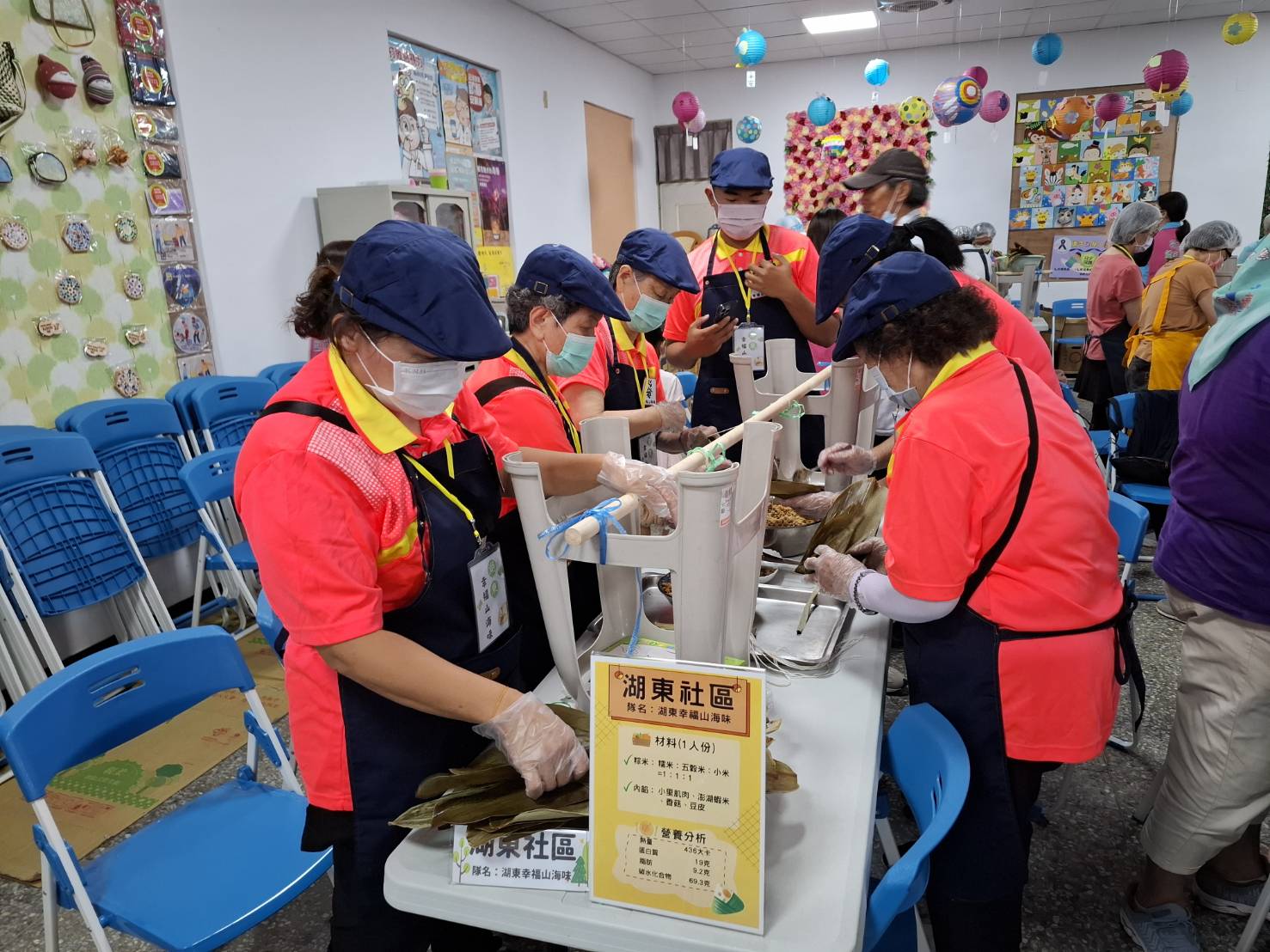 活動雖從10時才開始,但各社區不到9時就陸續將食材就定位,全是兼具營養又有特色的好料,有毛豆、藜麥、菜豆、南瓜、花生、蝦米、芋頭、鳳梨、雞胸肉等等,甚至還有土魠魚,相當豐富。半小時的時間,各組一下子就將20顆粽子包好,下鍋蒸煮,粽香四溢。