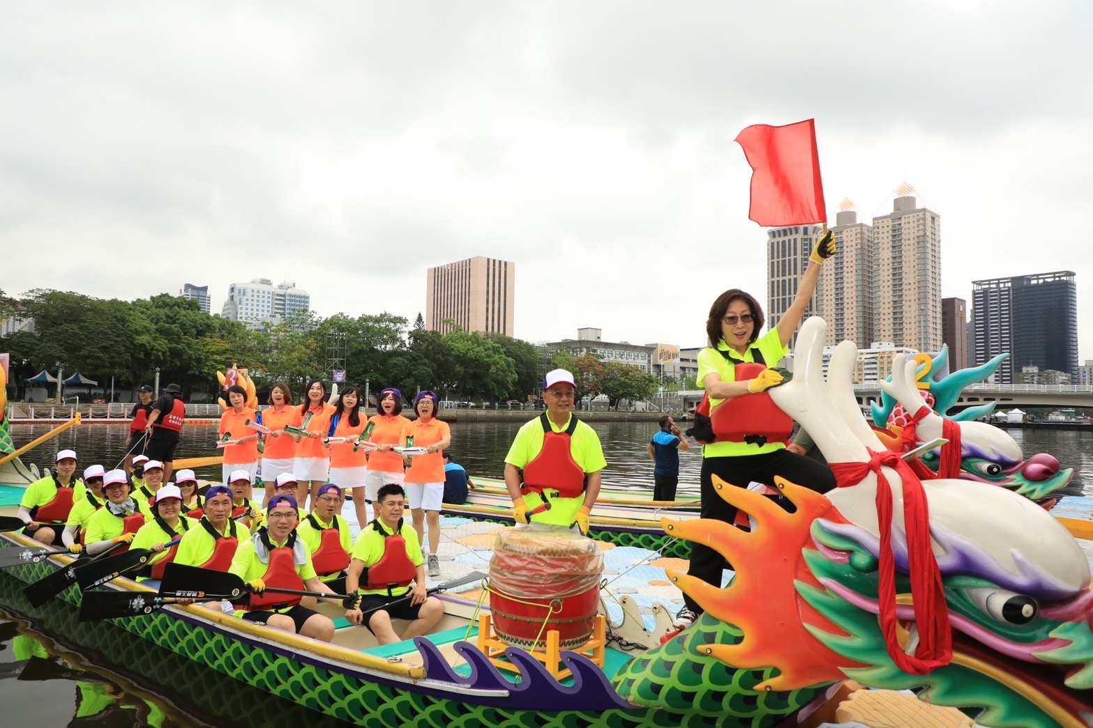 除市府隊之外,今年賽事還加入美國在台協會高雄分處「AITK」隊、日台交流協會高雄事務所「絆」隊,要與議會「議起划」龍舟隊一決勝負。昨(5)日定期大會閉幕式才告誡市府不能不講「武德」的康議長,今(6)日也來到愛河畔督軍,更親自登上龍舟幫隊員們加油、驗收訓練成果。