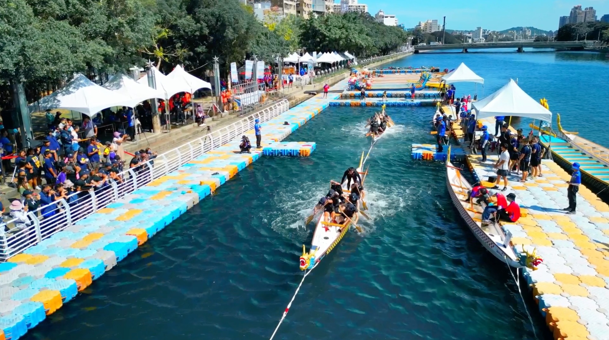 今年夜間龍舟睽違四年重磅回歸點亮愛河畔夜晚,白天吸睛亮點也不少,今年高雄愛河龍舟是全台唯一最多啦啦隊集結應援的龍舟賽,開幕式下午4時在音樂館前登場,由Aqua Mermaids、Fubon Angels及Luxy Girls啦啦隊帶來熱力四射表演,並與市長陳其邁及貴賓們一起為活動揭開序幕。