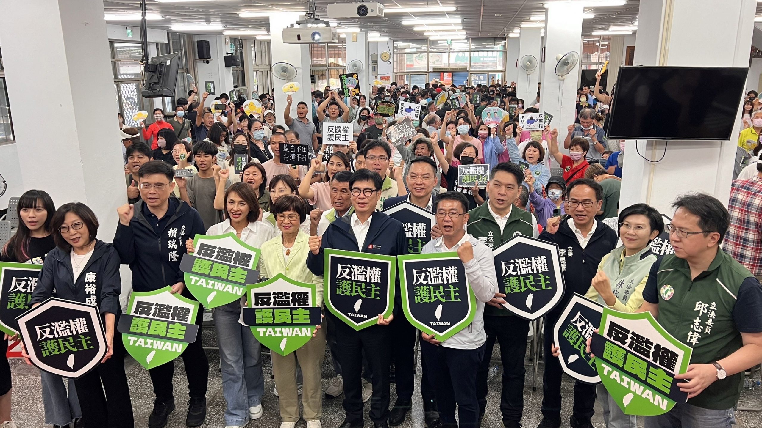 國會擴權覆議案將於21日投票表決,民進黨高雄市黨部主委黃文益於16日下午舉辦「反濫權、護民主!」座談會,現場湧進近千人,高雄市長陳其邁、中央黨部副秘書長何博文、立法委員王定宇及高雄八位立法委員邱議瑩、邱志偉、李柏毅、林岱樺、李昆澤、黃捷、許智傑、賴瑞隆,高雄市議會議長康裕成、高雄市議員張漢忠、林智鴻、李雅慧、黃秋媖、李喬如、黃彥毓、黃文志、湯詠瑜等全體出席。高雄市長陳其邁指出,人民對藍白國會擴權的怒吼聲,國民黨都沒聽到?沒聽到的話,我們再大聲一點!「沒有討論,不是民主」!
