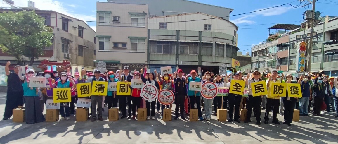 高雄市政府今(6/20)日上午於鳳山區鳳邑牛稠埔北辰宮舉辦「鳳山區7里聯合環境大掃蕩,現場由陳盈秀副秘書長率領市府防疫團隊及鳳山區鎮北里、忠誠里、武松里、北門里、文山里、文英里及文華里等7里長及里志工隊進行環境整頓及容器減量工作。