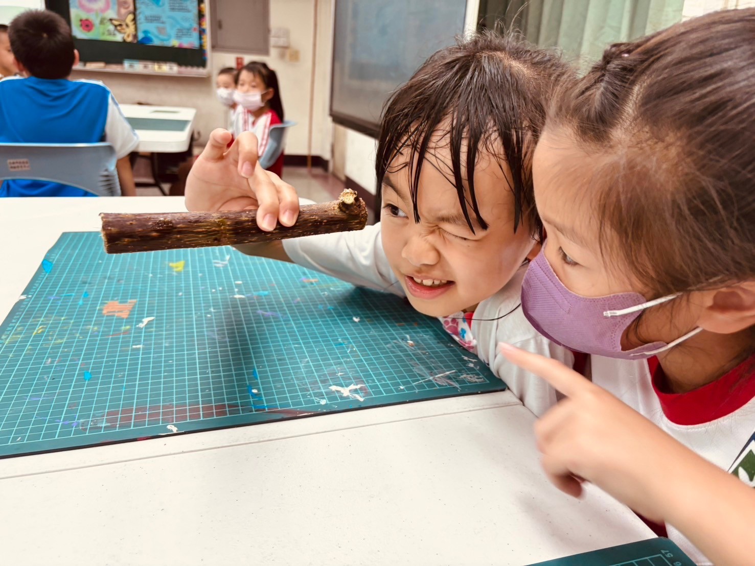 課程結束後,學生們紛紛表示受益良多,美術班5年10班的蔣詠臣同學說,我設計的圖樣是林園才有的特有生物「倒立水母」,把水母的模樣簡化設計後,創作在樹皮畫布上,透過作品呈現,大家可以了解林園區的特色。