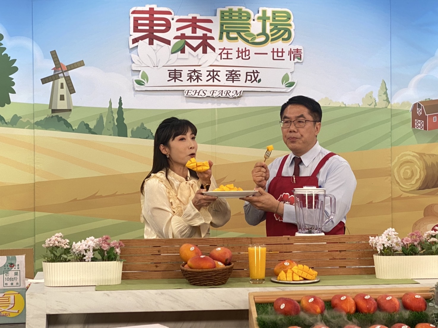 【記者林偉呈/臺南報導】夏日消暑盛品臺南芒果開賣囉!今(4)日臺南市長黃偉哲特別親自北上,參加電視購物平臺直播節目,向全國消費者極力推銷臺南愛文芒果。為了因應廣大消費者的需求,東森農產此次備貨2000箱計12公噸芒果線上開賣,現場電話聲絡繹不絕,40分鐘就完售供不應求,讓主持人又驚又喜,盛讚黃偉哲不愧是臺南芒果的「最佳銷售員」!