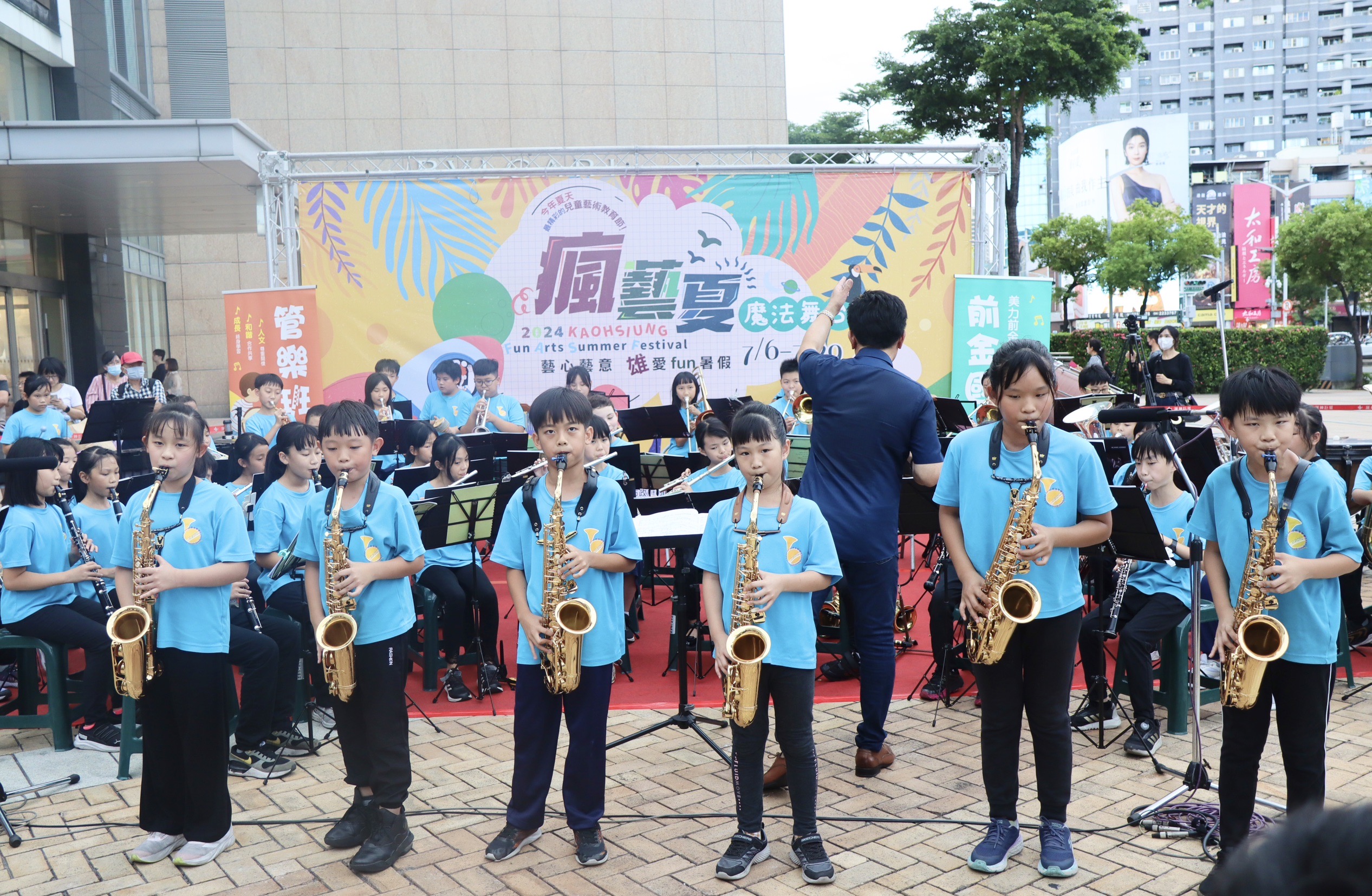 今天「瘋藝夏」活動首場上場演奏的是前金國小、陽明國小管樂團,以及大仁國中國樂團、鼎金國中舞蹈班的表演;現場音樂聲、翩翩舞姿炒熱夏天,吸引親師生、民眾們到場欣賞。