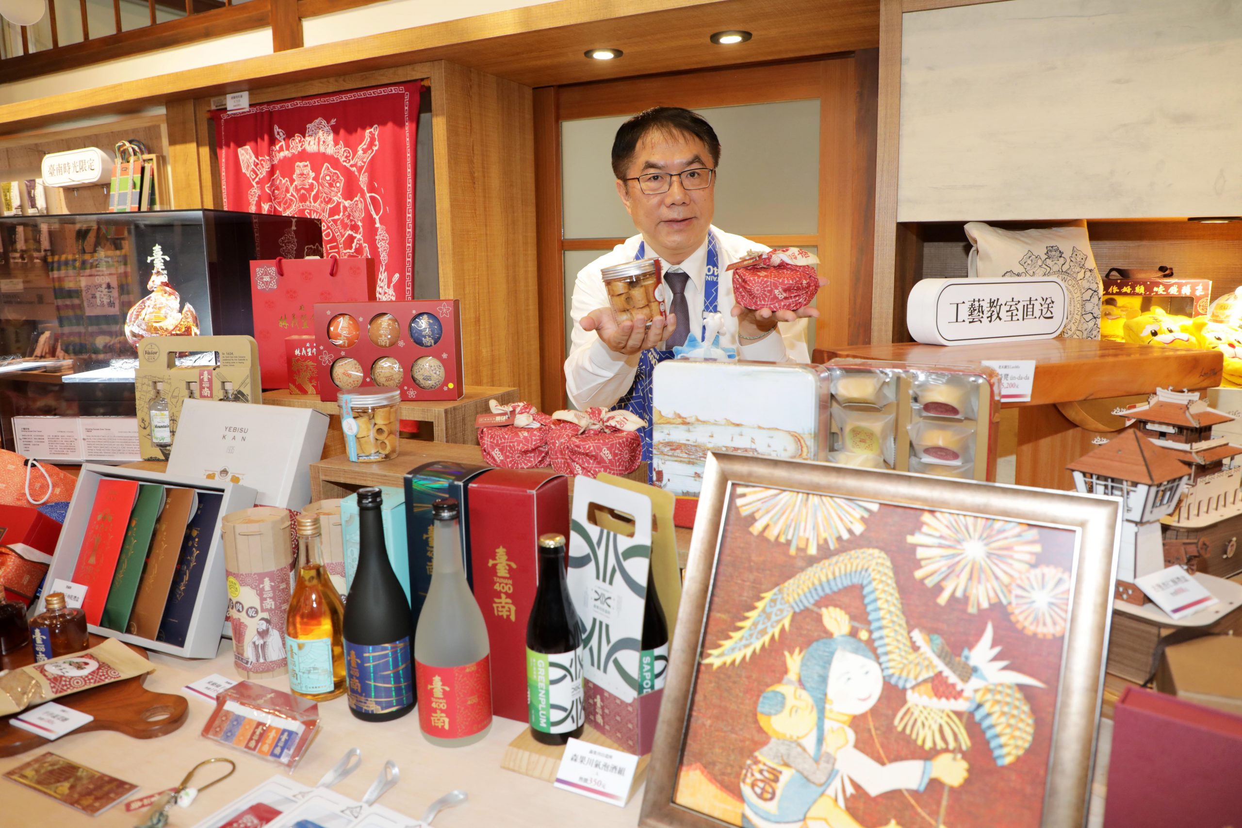 市長黃偉哲任一日店長加碼滿額贈吉祥物周邊商品。(台南市政府提供)