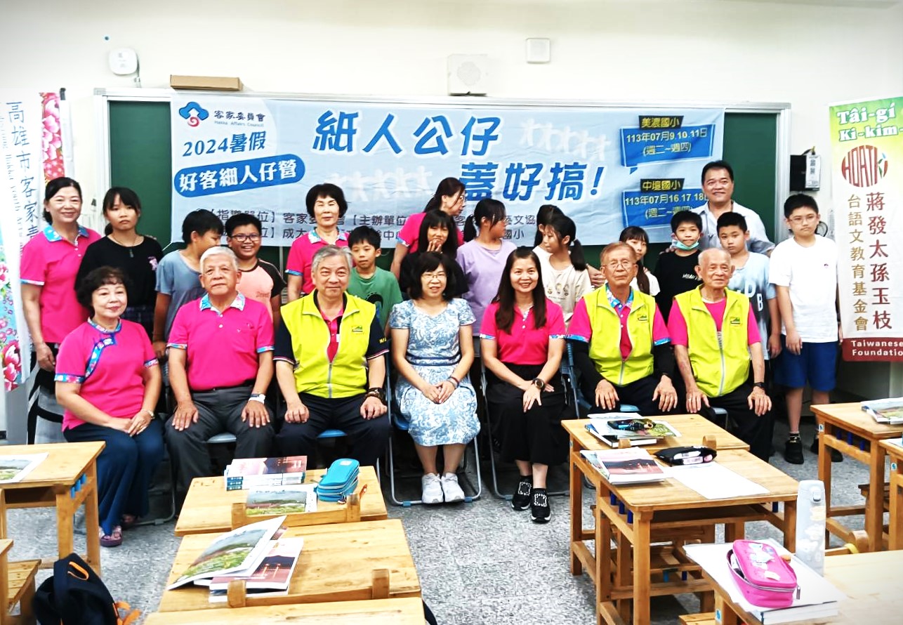【記者黃山高高雄報導】客家委員會指導高雄市客家青年藝文協會9、10、11日於美濃國小舉辦「2024暑假。好客細人仔營-紙人公仔,蓋好搞!」客語文學營,岡大會創會長蔣榮欽、總顧問蔡文章教授、張哲男校長、理事謝武強、副執行長李昌幸,高市客青協會理事長曾淑琪、常監傅喜招、前理事長鍾旭華、總幹事邱麗君、理事鍾華緯等十餘人與美濃國小校長邱彥瑄9日上午共同舉辦始業式。