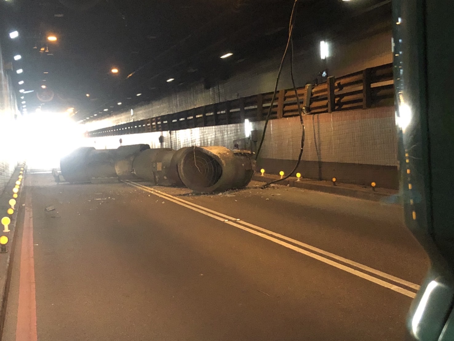 【記者林韋呈/高雄報導】高雄旗津過港隧道旗津往前鎮方向事故全線封閉,位於隧道上方的鼓風機被撞下來,高雄港警已派員疏導交通。