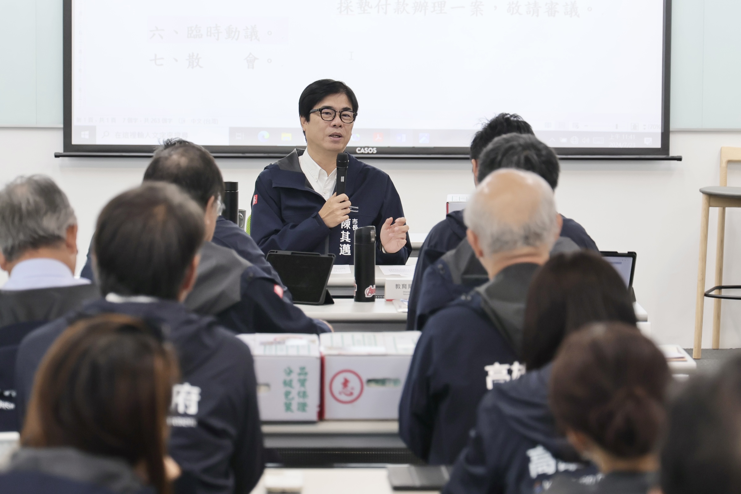 市長陳其邁主持市政會議,因應凱米颱風來襲,指示各局處嚴正以待,預先做好防颱整備。(高雄市政府提供)