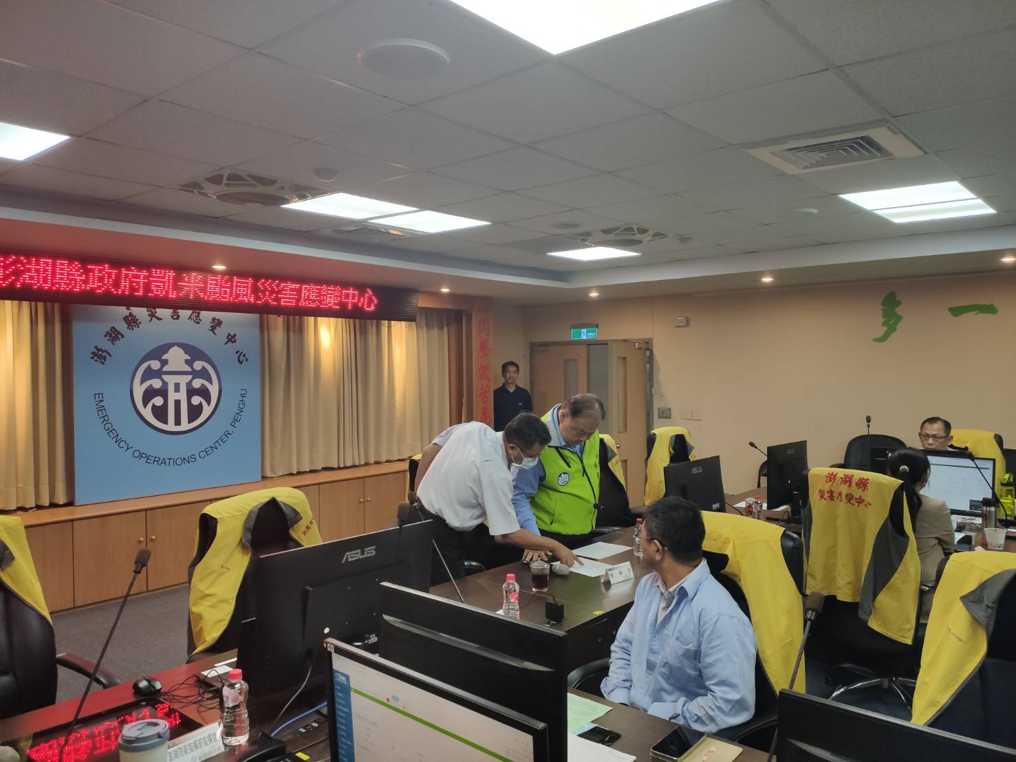陳光復指出,每次颱風來襲,應變中心的值勤同仁24小時不分晝夜輪班值勤,他表示感謝,尤其第一線的防救災人員更是辛苦,提醒前往處理各項事故時,務必要注意自身安全。