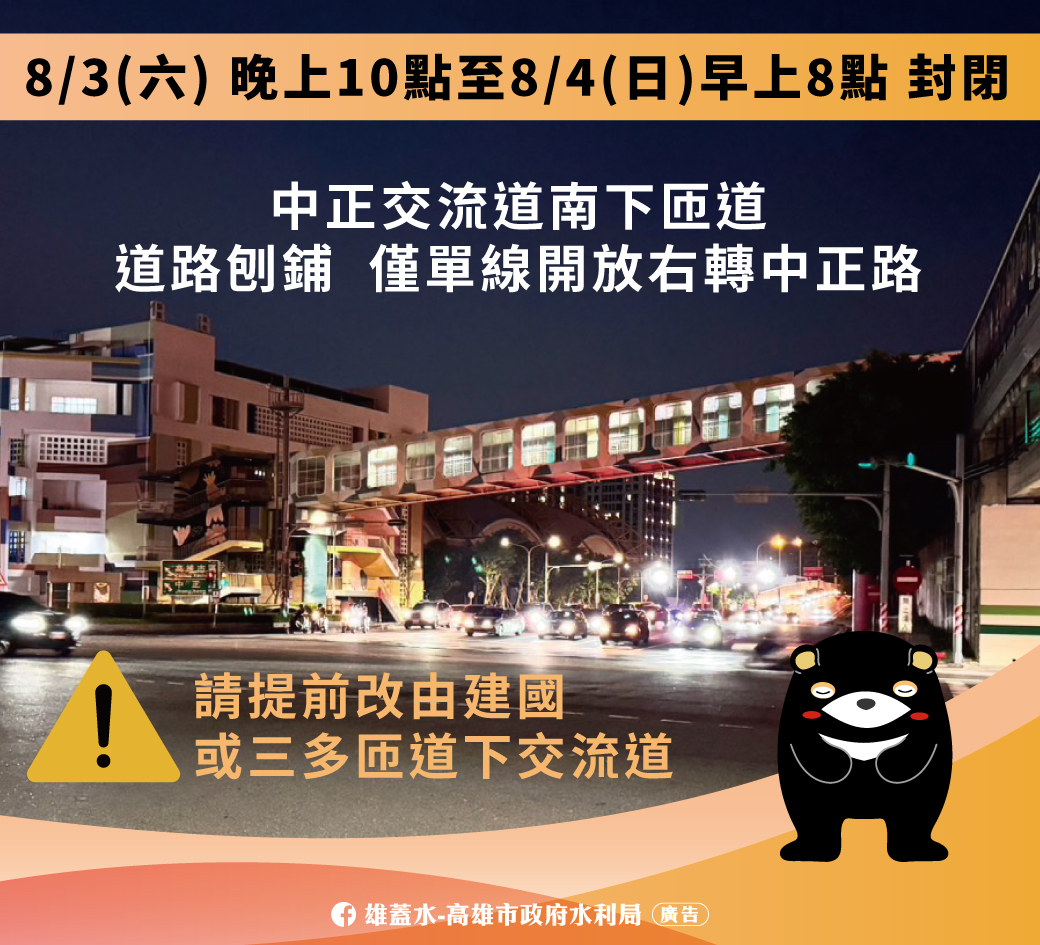 【記者黃思慈/高雄報導】高市府水利局辦理「苓雅區中正交流道排水改善工程」,已於7月上旬施作完成,將進行路面刨鋪復舊作業,為降低交通衝擊,將採夜間施工,預計113年8月3日(星期六)夜間22時封閉至8月4日(星期日)早晨8時開放通車。