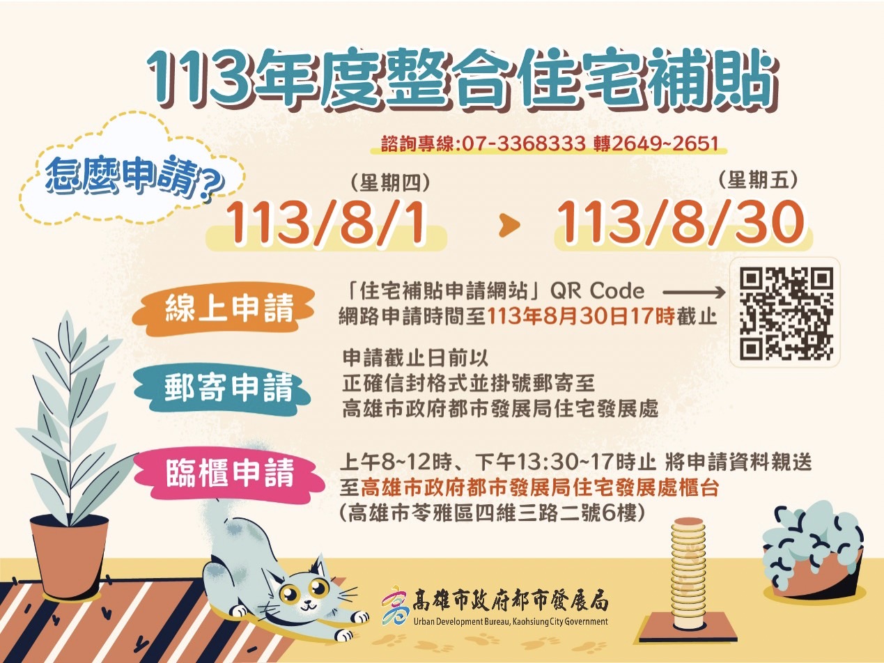 (記者林韋呈高雄報導)113年度自購住宅貸款利息補貼及修繕住宅貸款利息補貼,已於8月1日起開放受理申請,截止日為8月30日,歡迎在高雄市有購屋或修繕房屋需求,且符合資格之民眾把握機會踴躍申請。