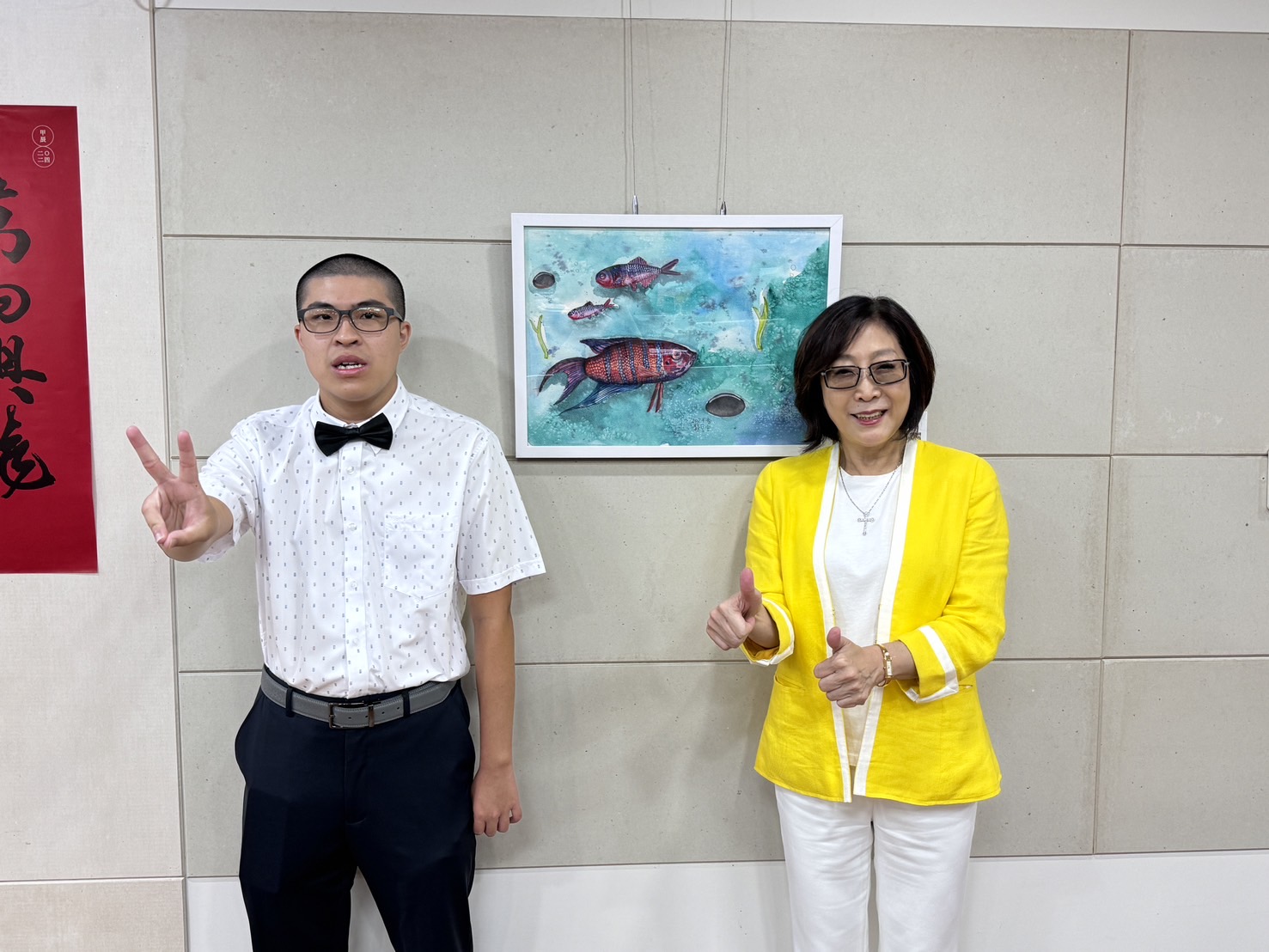 蔡昱安花費2週時間完成「牛屎鯽與蓋斑鬥魚」,每天抓緊短暫的注意力作畫;看著「牛屎鯽與蓋斑鬥魚」作品,康議長充滿欣賞眼神,她說,星星兒成長之路充滿荊棘,期盼蔡昱安持續努力學習,綻放鑽石般的耀眼光芒。