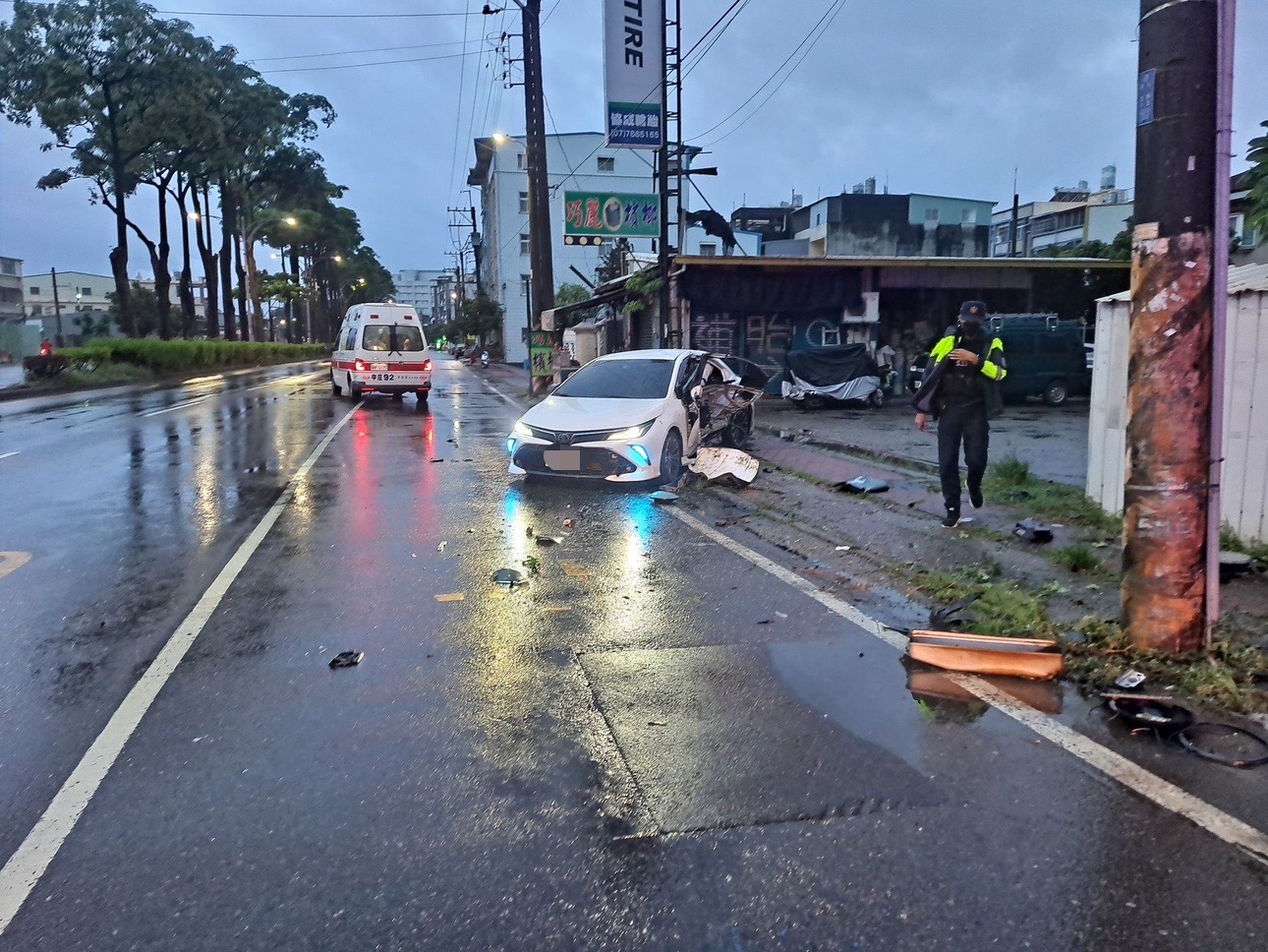 大寮區光明路三段昨下午發生自撞路邊電桿事件後,今(10)早又在同地段發生同樣事件,警方表示,現場為30歲黃姓男子駕駛自小客車,沿光明路三段北往南行駛時,至事故地點時因為彎道以及雨天路面些許積水,以致車輛打滑左側車身自撞路邊電桿,黃男受傷送醫無生命危險,駕駛酒測值為0,全案已依規定測繪、照相處理,詳細肇事原因有待鑑定。