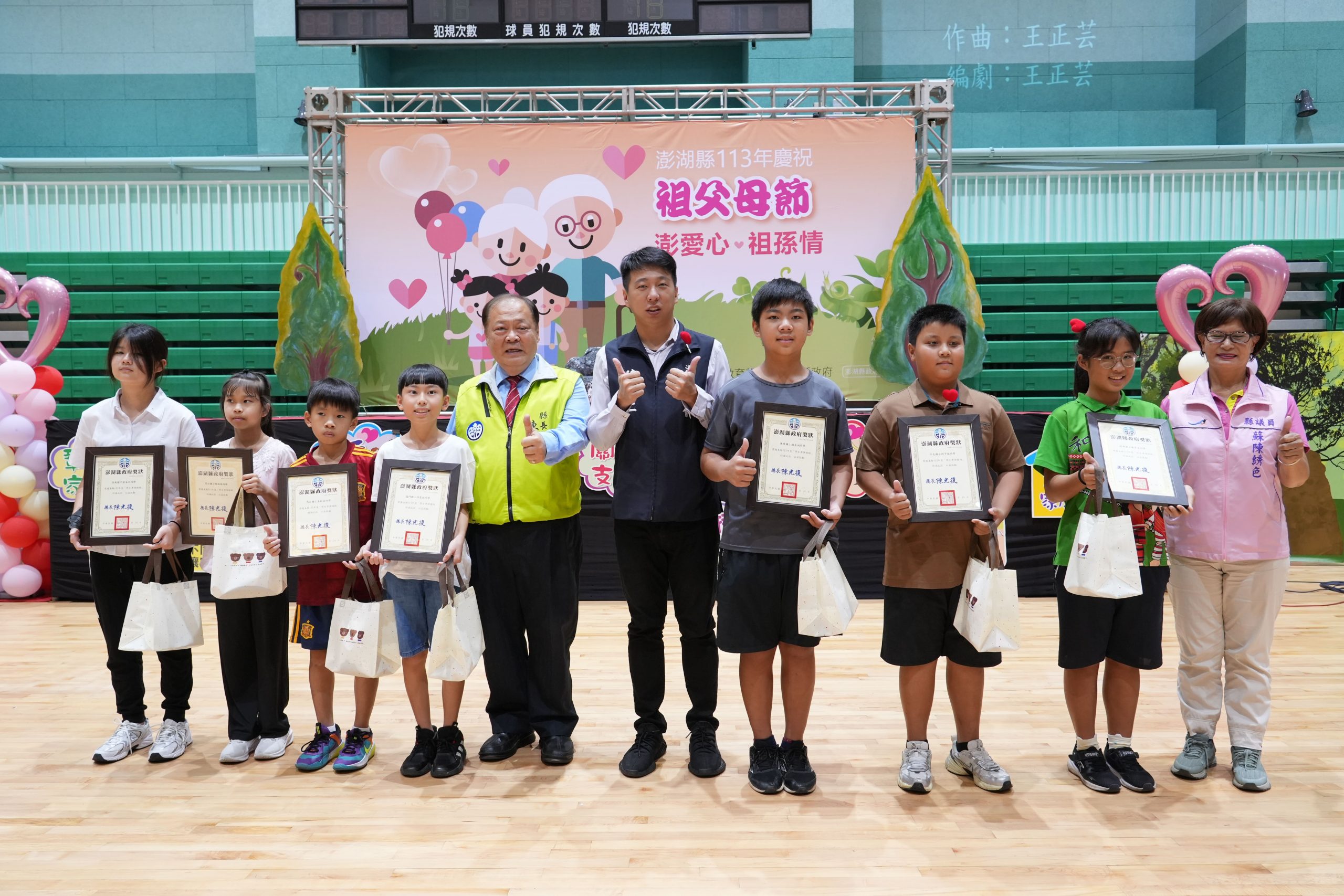 澎湖縣113年「學生孝悌楷模選拔」獲獎同學名單:澎南國中 翁采羽同學、馬公國小 賴昱瑄 同學、馬公國小 王柏霖同學、中山國小 劉靖恩同學、風櫃國小 顏芷葳 同學、隘門國小 許恩誠同學、後寮國小 謝承洲同學、中屯國小 劉子銘同學、內垵國小 李霽彧同學、將軍國小 陳茸杏同學;議長陳毓仁、議員蘇陳綉色、教育處長林長安、立委楊曜助理段湘玲、經濟部標準檢驗局副局長賴俊傑等人均一同前來共襄盛舉。