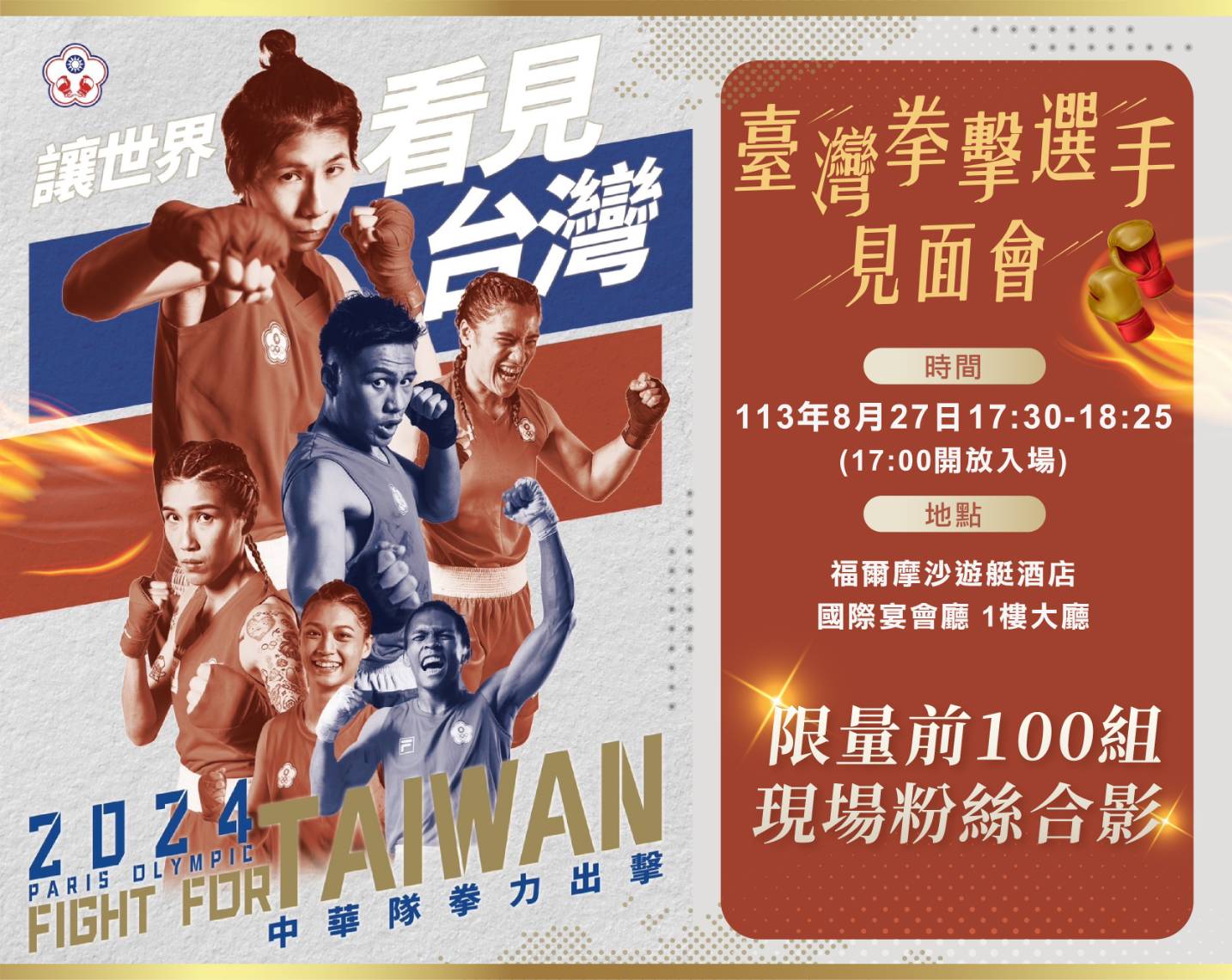 巴黎奧運拳擊好手來臺南,選手見面會定於8月27日(星期二)見面會下午5時30分至6時25分,下午5時即開放入場,地點在福爾摩沙遊艇酒店1樓大廳 (臺南市安平區安平路988號)。
