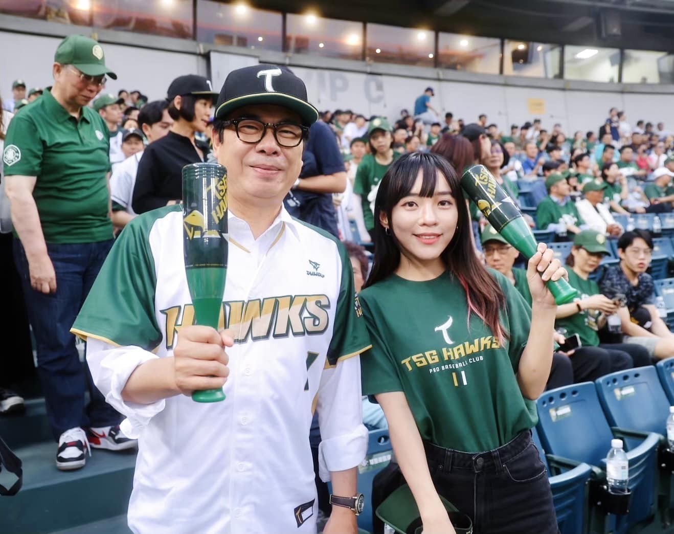 黃捷與高雄市長陳其邁幫台鋼雄鷹應援。(記者翻攝)