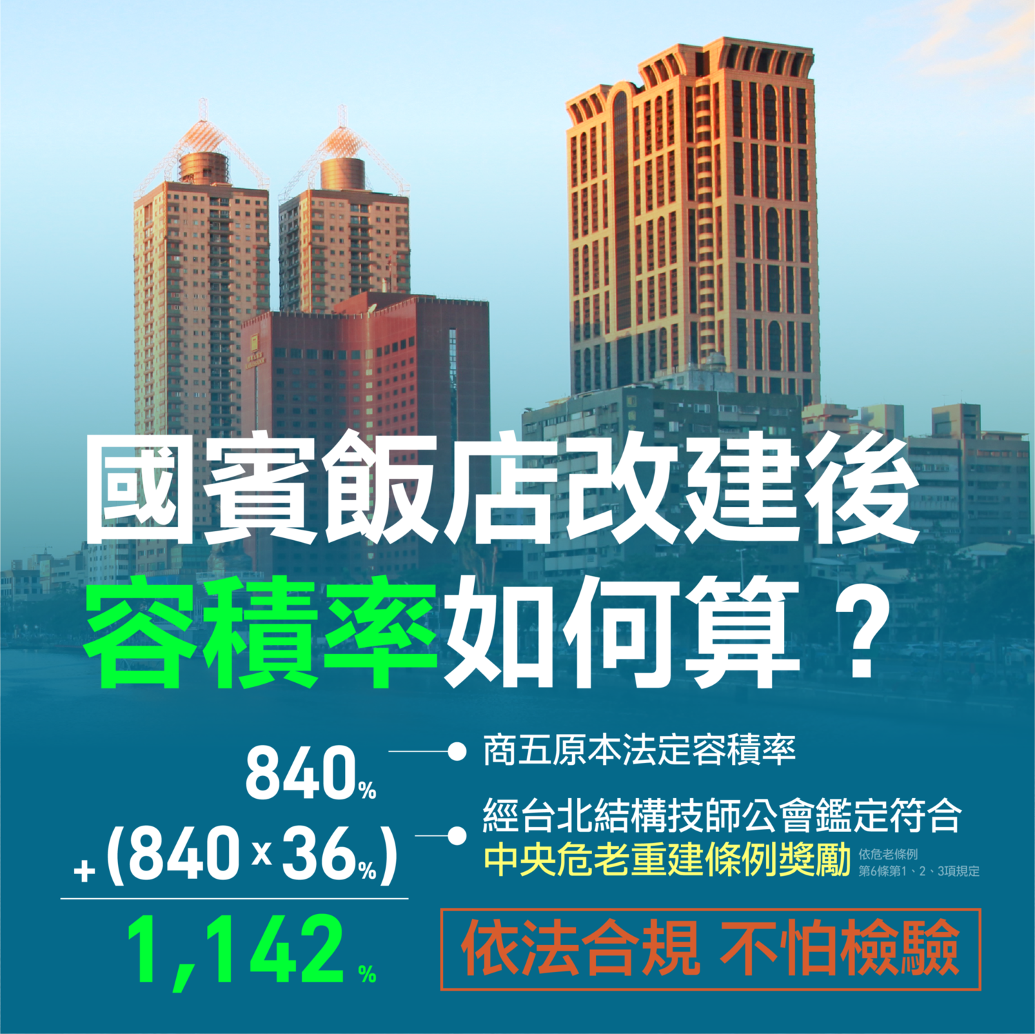國賓飯店的都市計劃土地使用分區是第五種商業區,自民國82年,本市實施容積率管制實施時,即訂定法定容積為百分之840,再加上111年7月18日,依法取得的危老重建獎勵36%,實設容積才來到百分之1142.4。