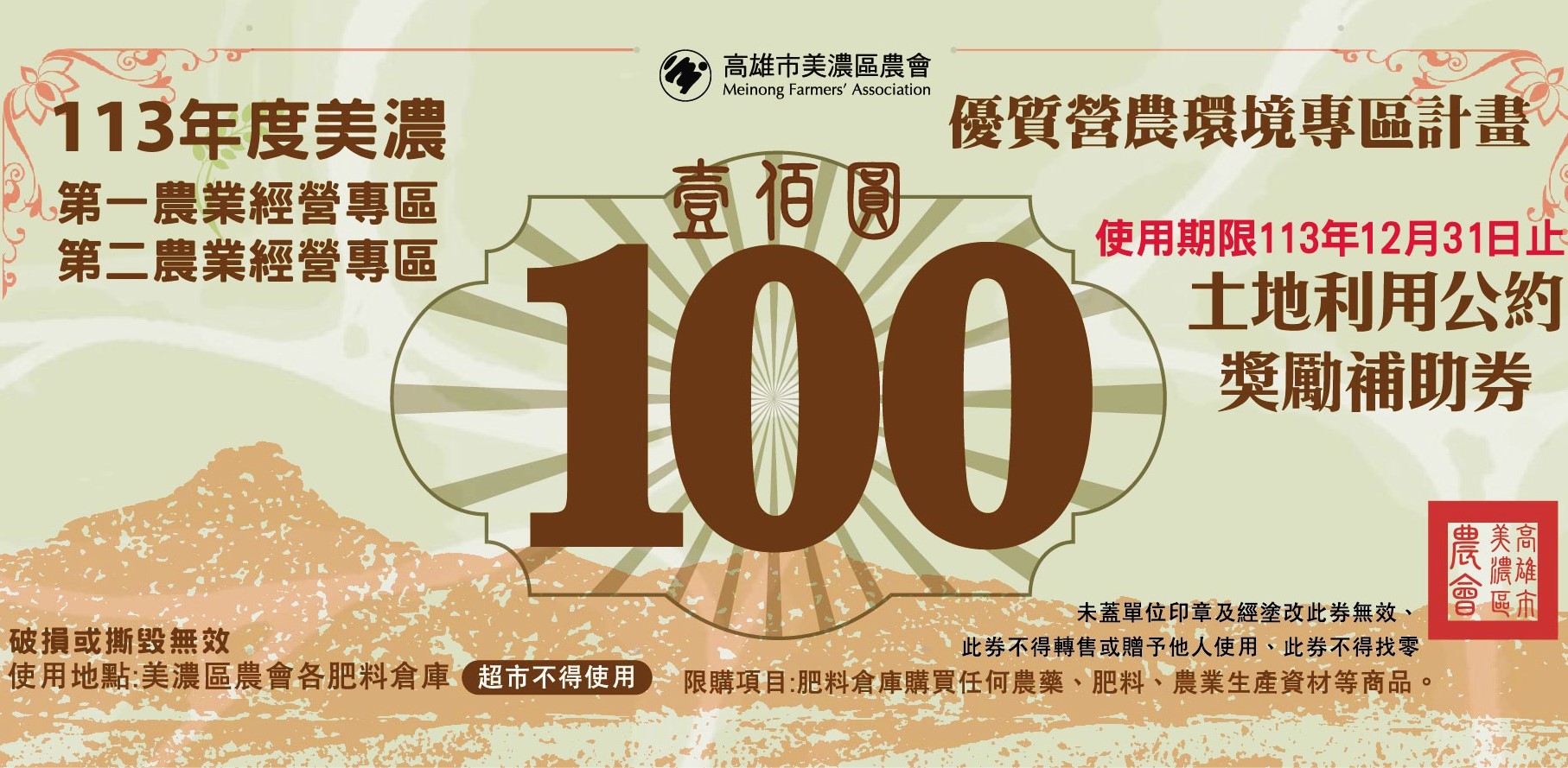 【記者劉昱彣高雄報導】美濃農會向農委會申請執行「專區土地利用公約」獎勵補助開始發放,收到通知單的農友本月30日前到推廣部領取農地專屬福利紅包,錯過就要再等一年。