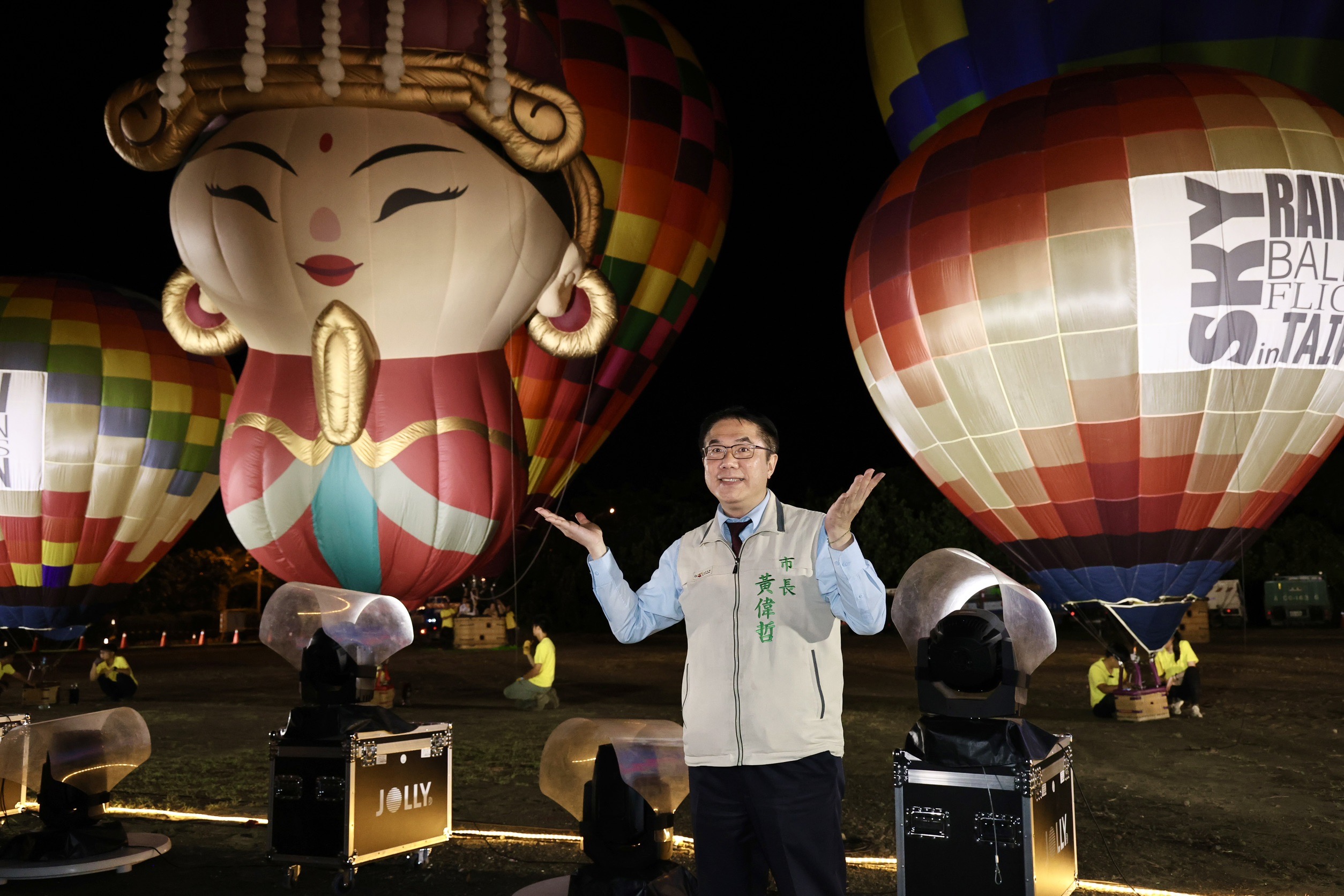 市長黃偉哲表示,現場的熱氣球光雕秀,由2顆標準球及4顆迷你球的熱氣球展出,伴隨著音樂節奏與燈光變化,點亮的熱氣球與光束效果互相輝映,帶給民眾視覺與聽覺的雙重享受!