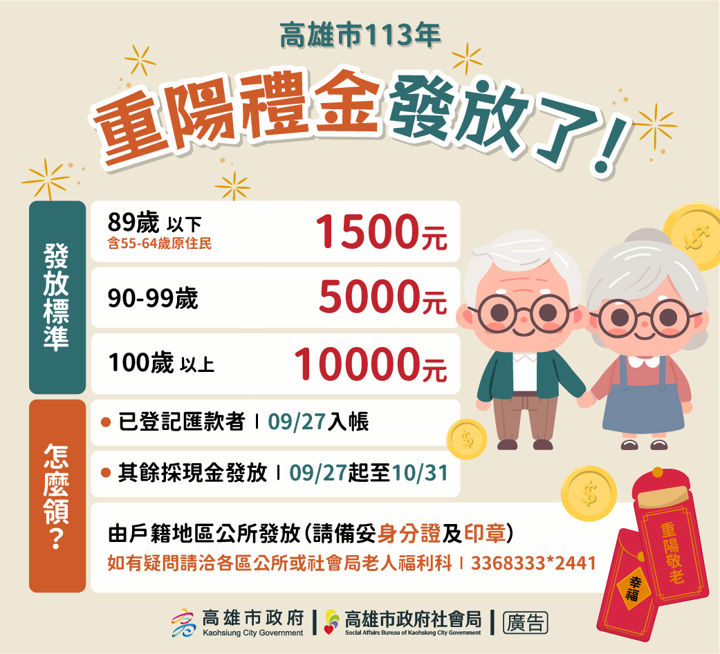 【記者吳冠賢/高雄報導】高雄市113年重陽節敬老禮金自9月27日起開始發放,55至64歲原住民及65至89歲長輩發給1,500元、90至99歲發給5,000元、100歲以上人瑞發給10,000元,預估逾55萬位長輩可領到禮金。
