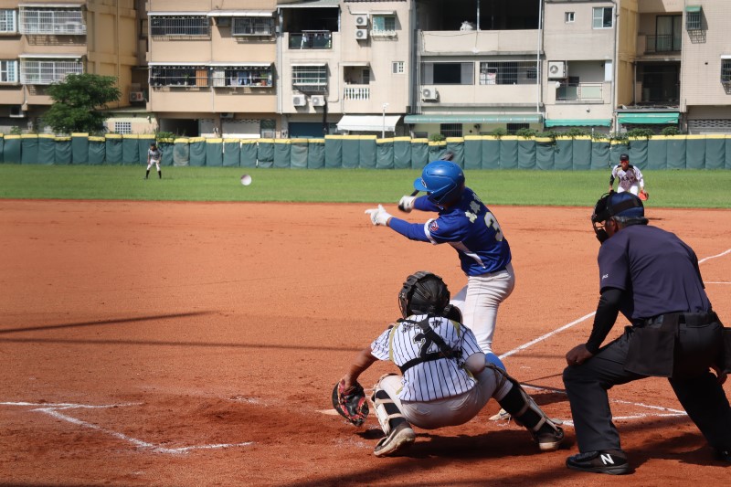 三民高中(藍色衣服)四局上張庭睿雖然轟出首日第一支全壘打,仍不敵對手的密集安打落敗。(記者翻攝)