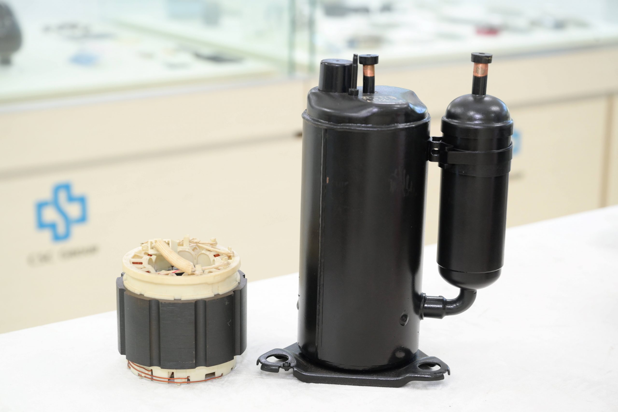 中鋼近期開發的50CS400P新世代壓縮機馬達用電磁鋼,在馬達效率方面發揮材料優勢,較市面上一般常規品降低20%鐵損,導磁率提升約50%。圖為電磁鋼所製作的馬達鐵芯(左)與冷氣用高效率壓縮機(右)。(中鋼提供)