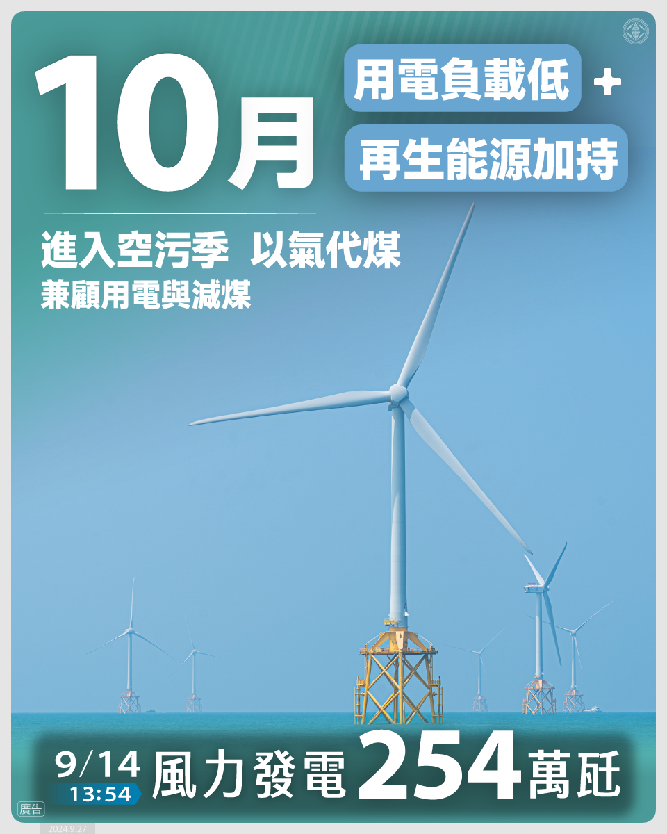 台電指出,當再生能源發電量增加時,燃煤與燃氣等機組便可以減少發電,以9月14日為例,風力瞬時發電量達254萬瓩,創下歷史新高,超過四部台中燃煤機組的裝置容量。秋冬季風力發電效果佳,可進一步擴大燃煤機組降載幅度,也替補傳統機組上場,讓歲修規劃更有餘裕。