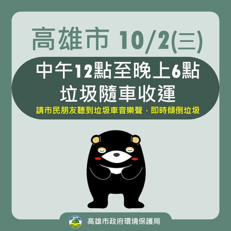 【記者魏正賜/高雄報導】因山陀兒颱風來襲,高雄市昨(10/1)日已停止收運垃圾,由於颱風移動速度緩慢,明天風雨可能不利清運,考量市民家中囤積垃圾,環保局今(10/2)日中午十二點至晚上六點,啟動各責任區隨車收運工作,請市民朋友聽到垃圾車音樂聲,即時傾倒垃圾。